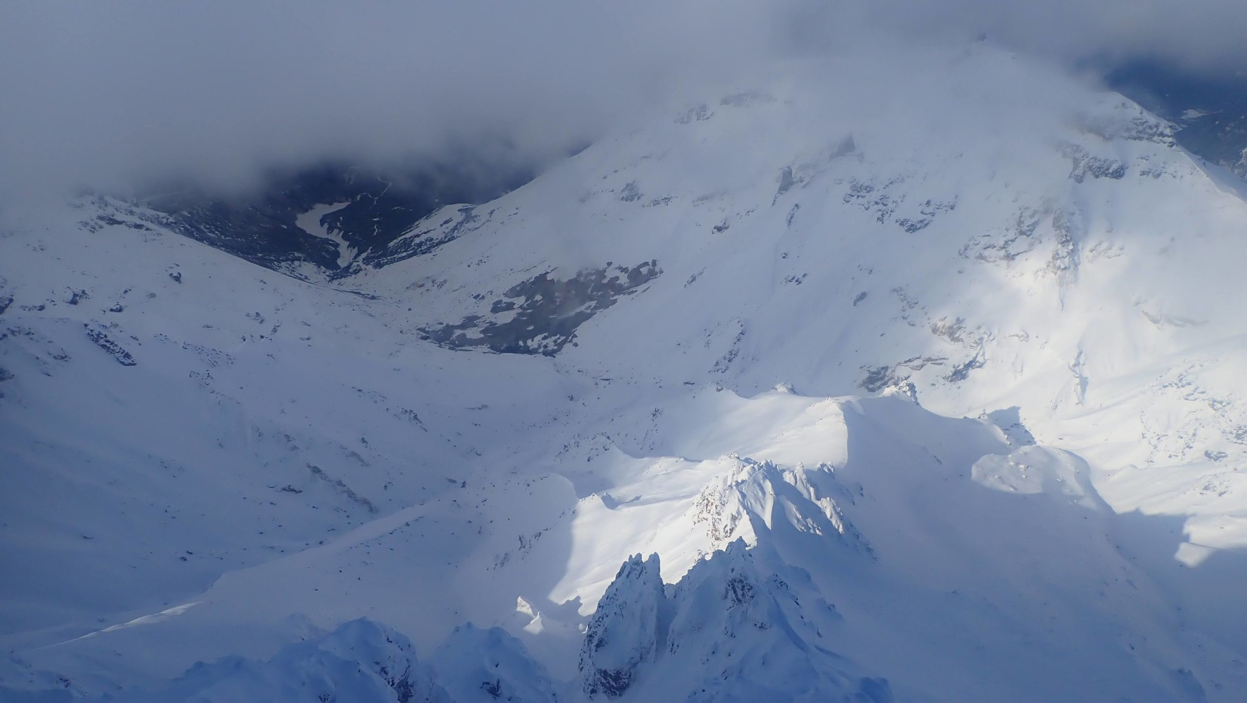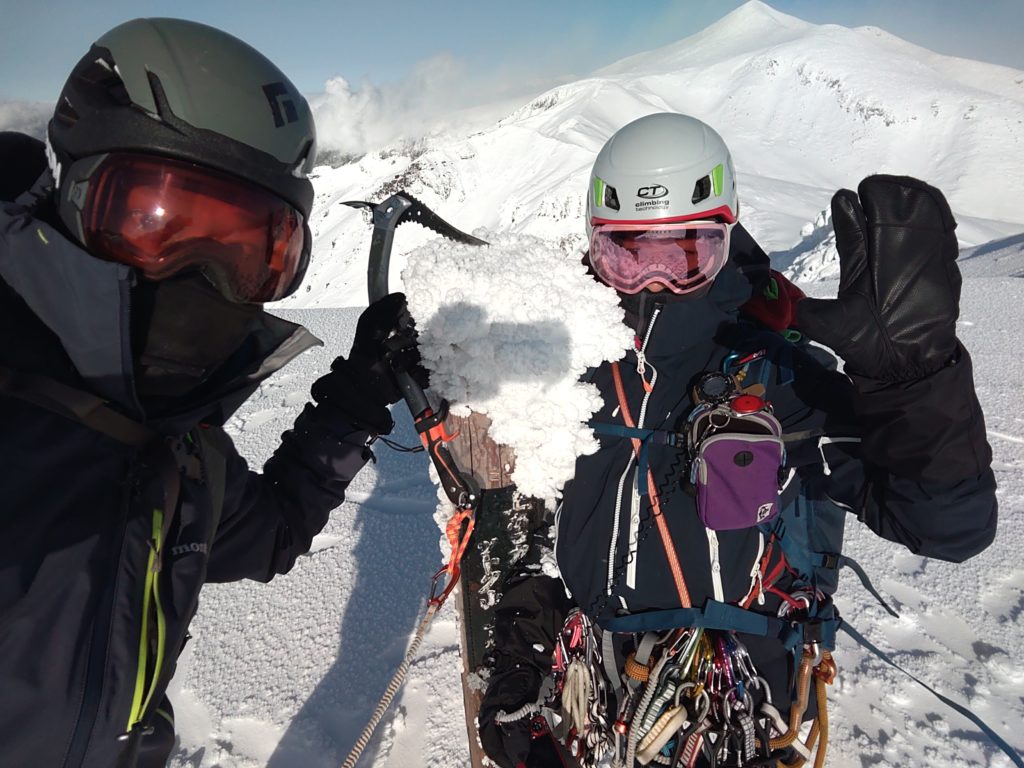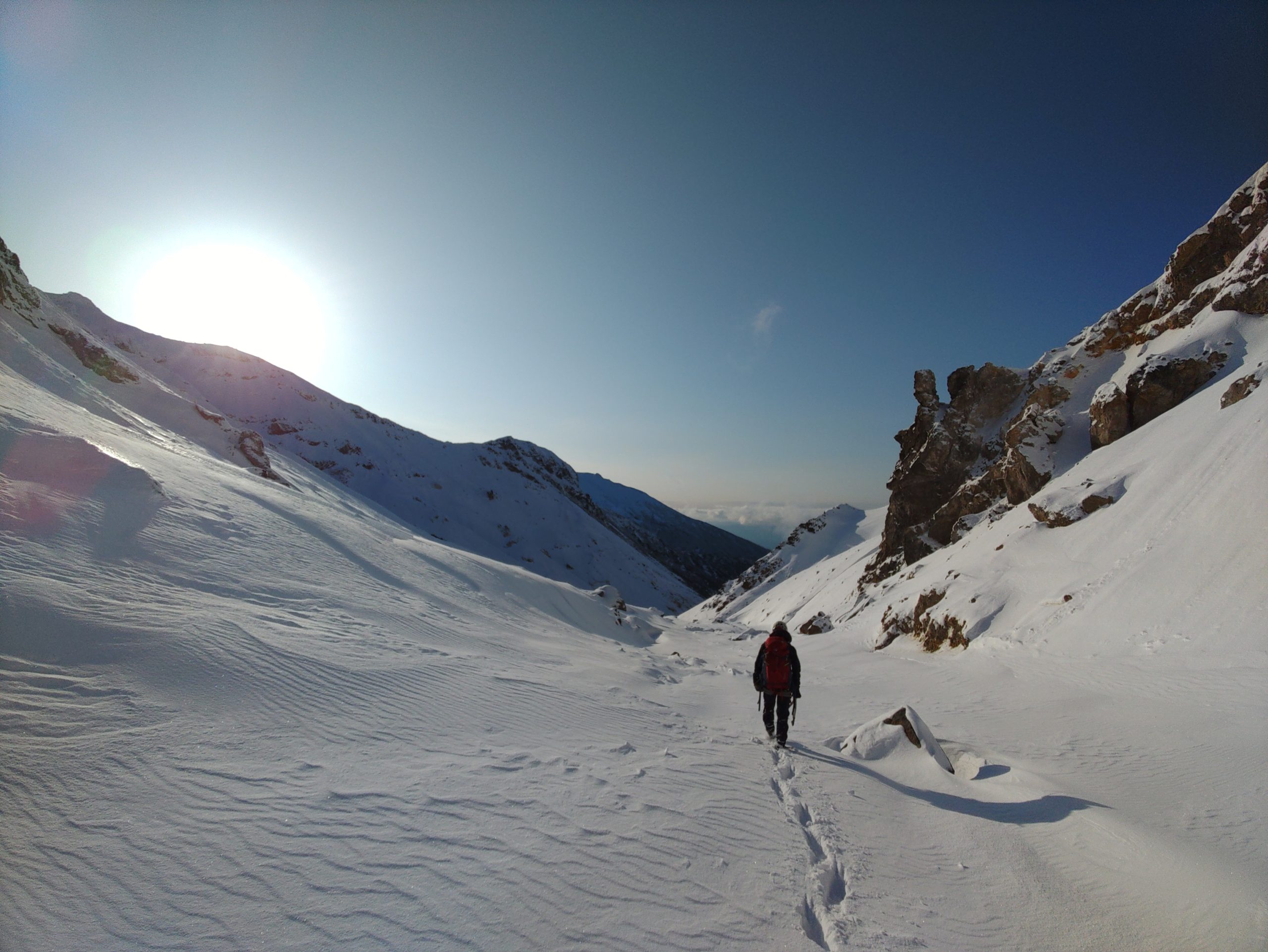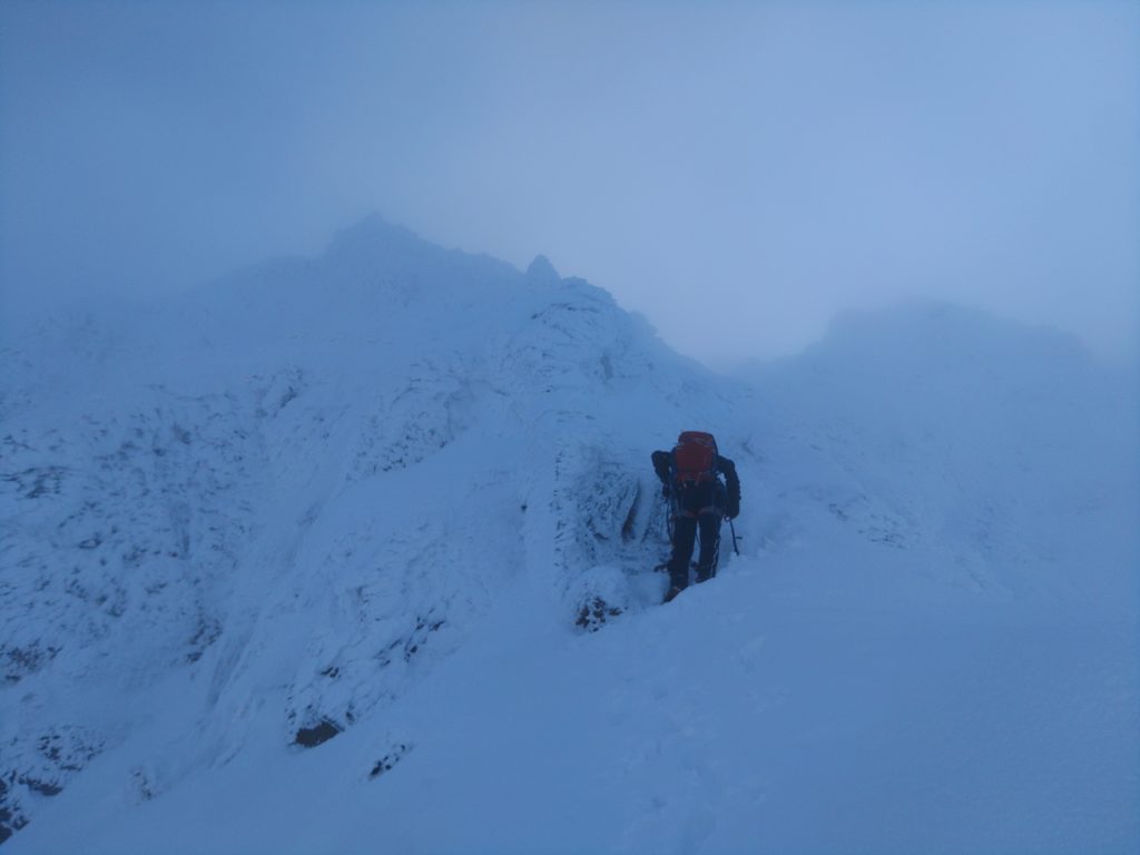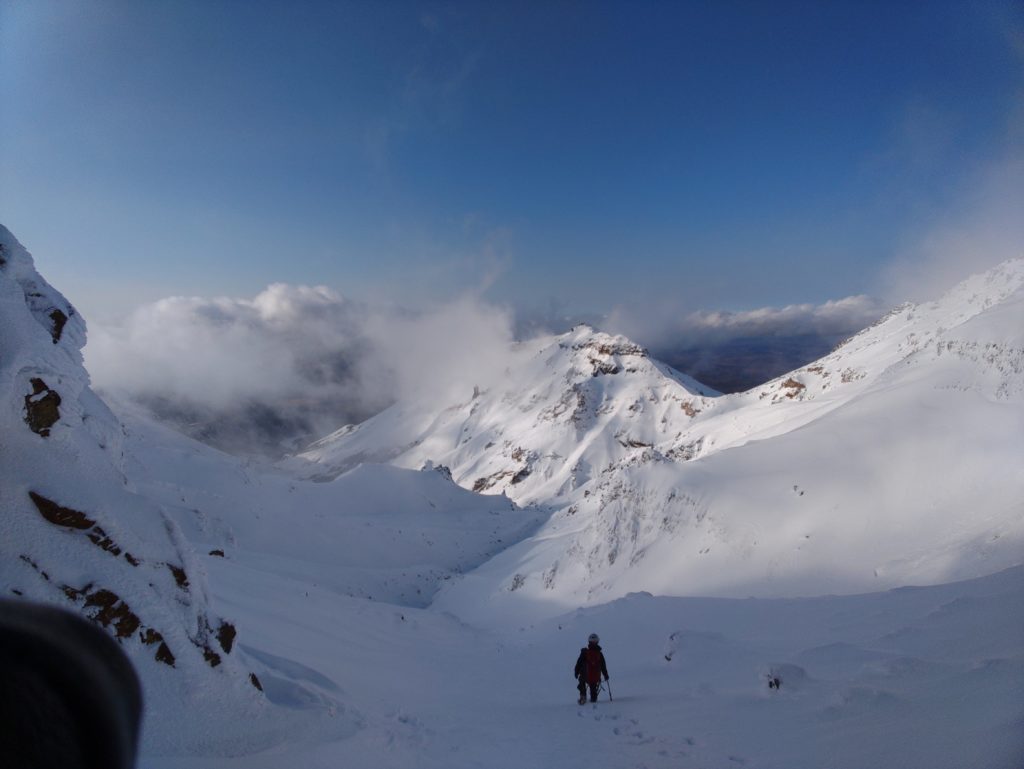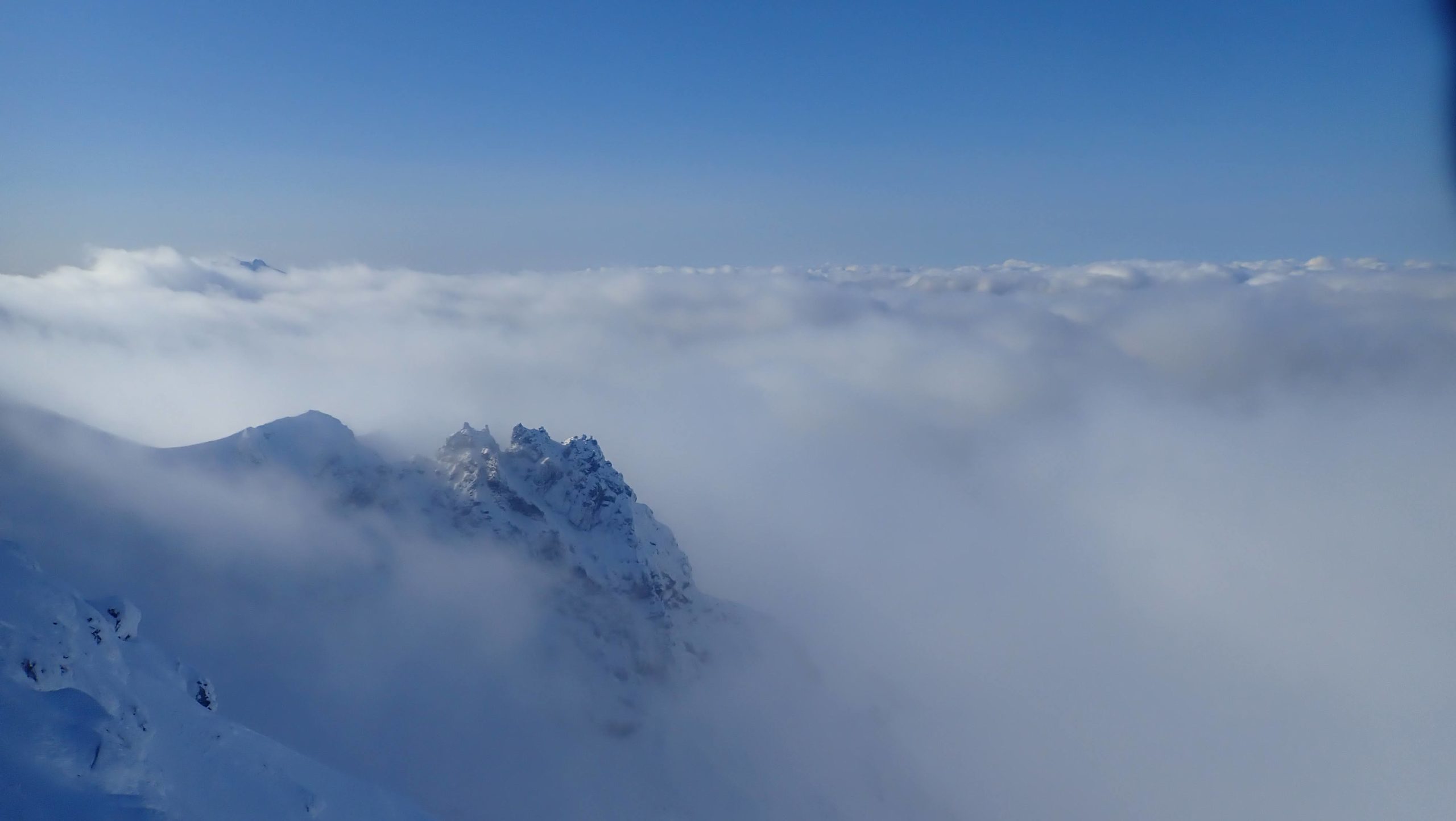 雪稜も雪は少ないが割と歩きやすく安定。この頃から下山は下降ルンゼでいいかもと思い始める