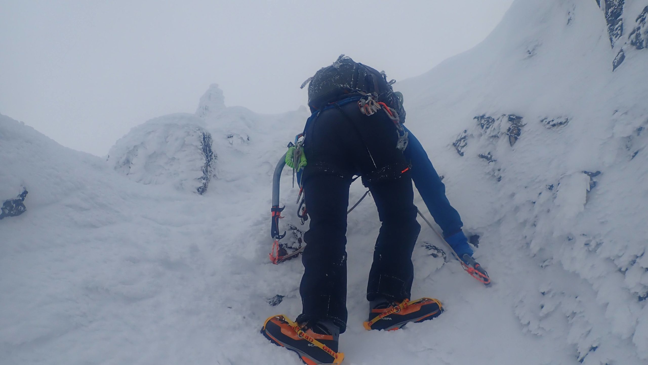 岩塔。最初の核心部。例年より雪付悪いが露出した岩に爪を乗せながら何とかかんとか