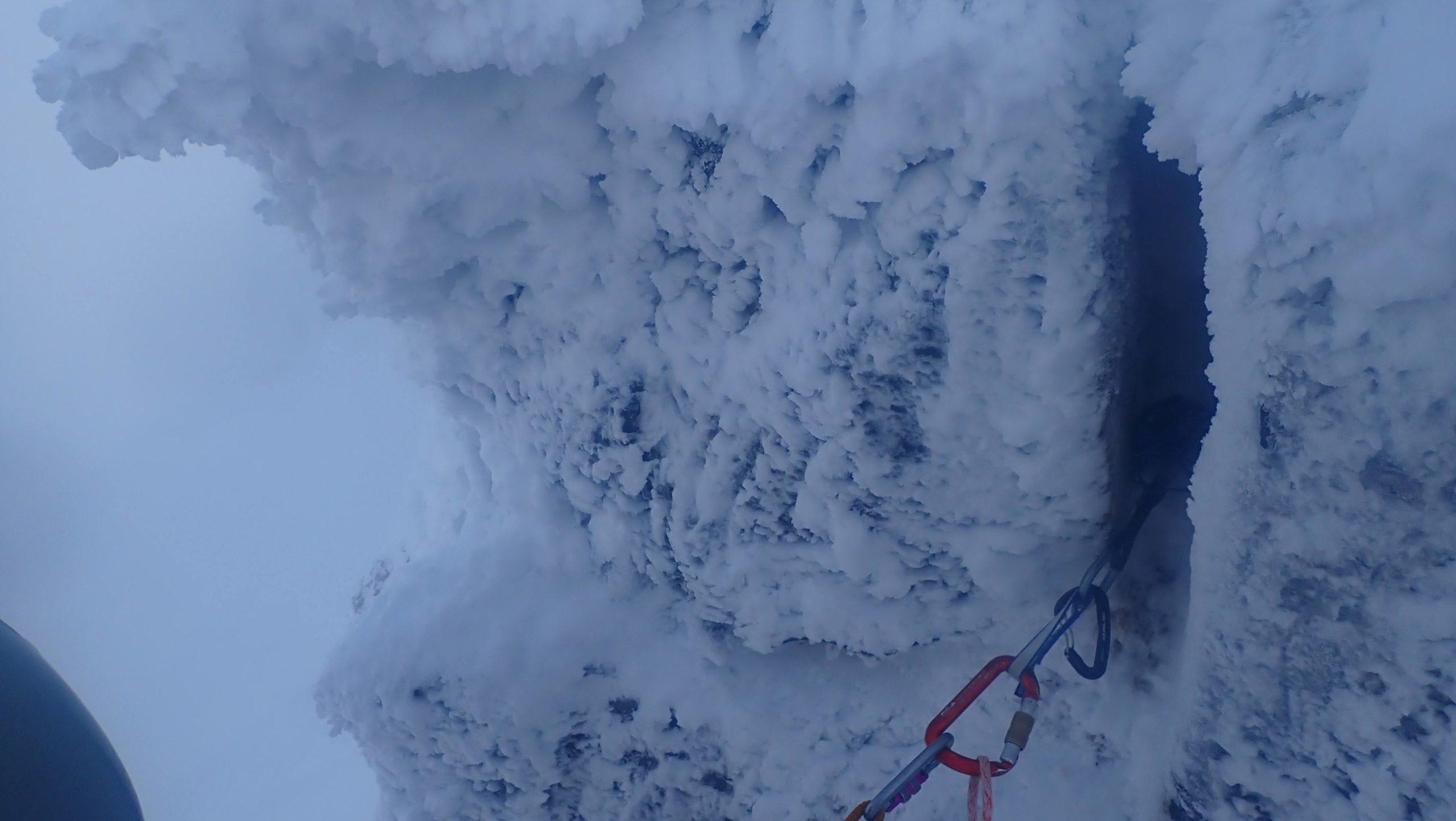 グサグサ雪でアックス決まらず。ほとんど岩を使って攀じる。プロテクションはイボハーケンで2か所。