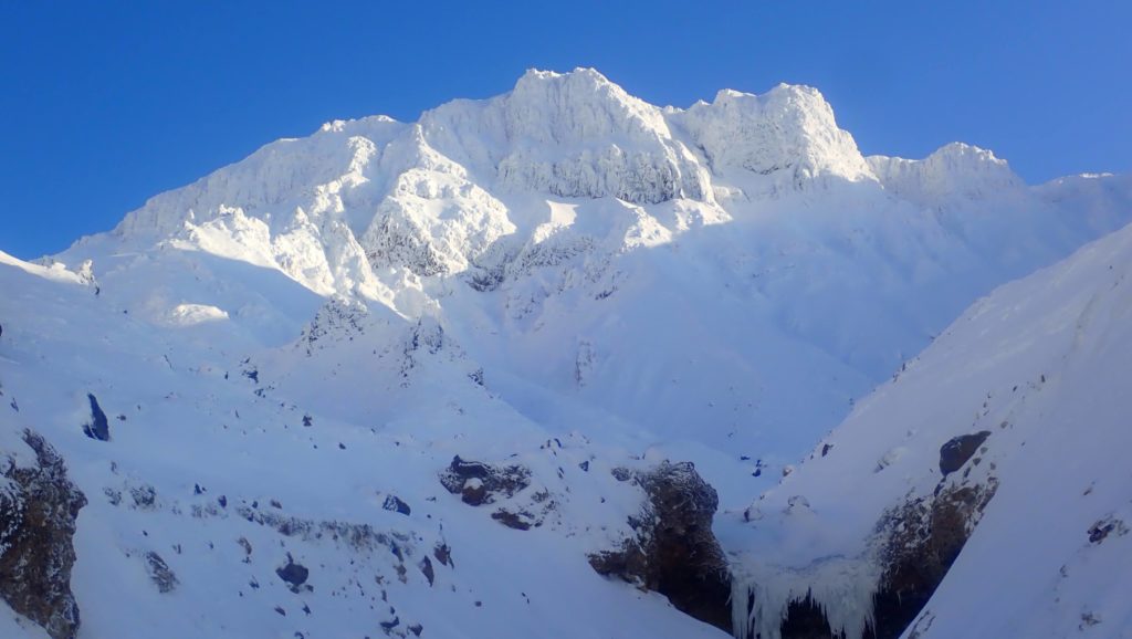 北西稜と正面壁の全景。遠目は雪が豊富に見えてしまう。