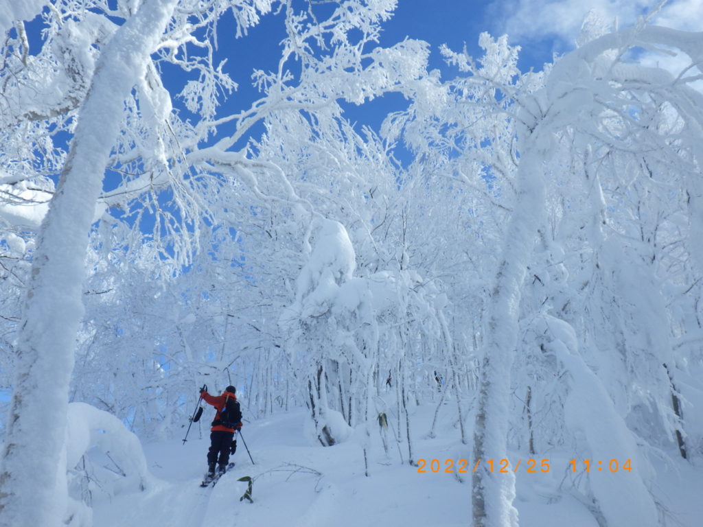 頂上付近にはウサギの足跡や食み跡や糞が沢山ありました。動物の足跡を見るのも冬山も楽しみの一つであります。冬は葉や笹がないので、時々ウサギを見ることができますね。それにしてもウサギの走るのが速いこと!