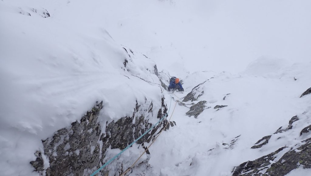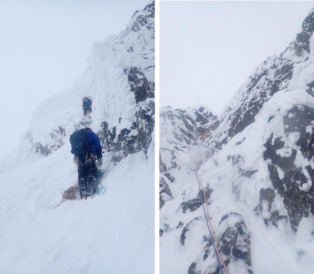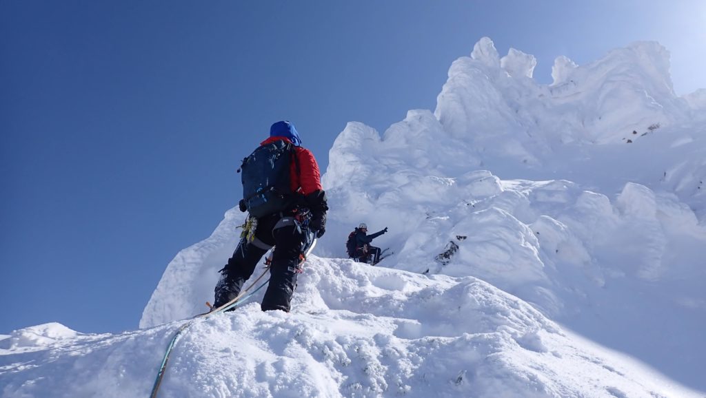 右は1p目が核心。慎重に、かつ思い切りの速さで突破。画像は2p目の雪壁