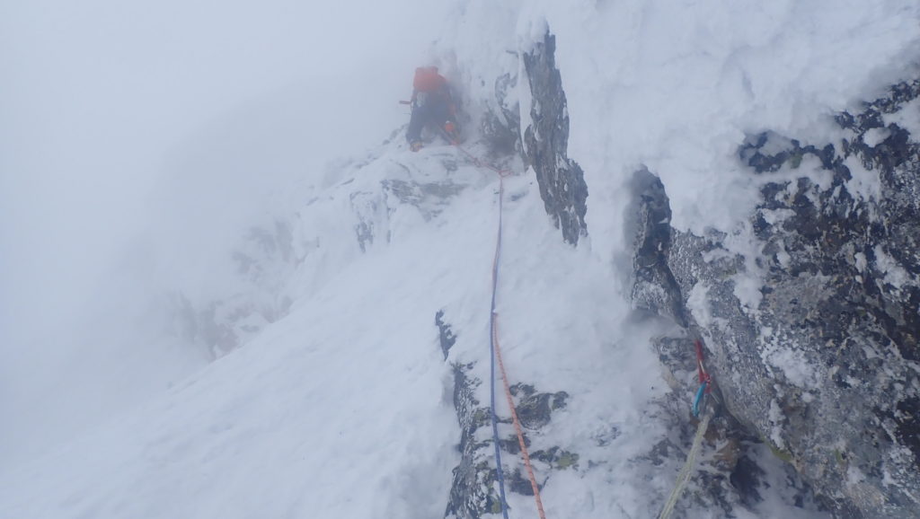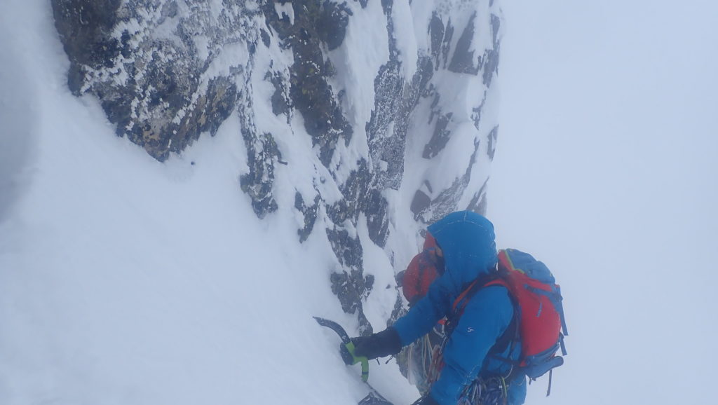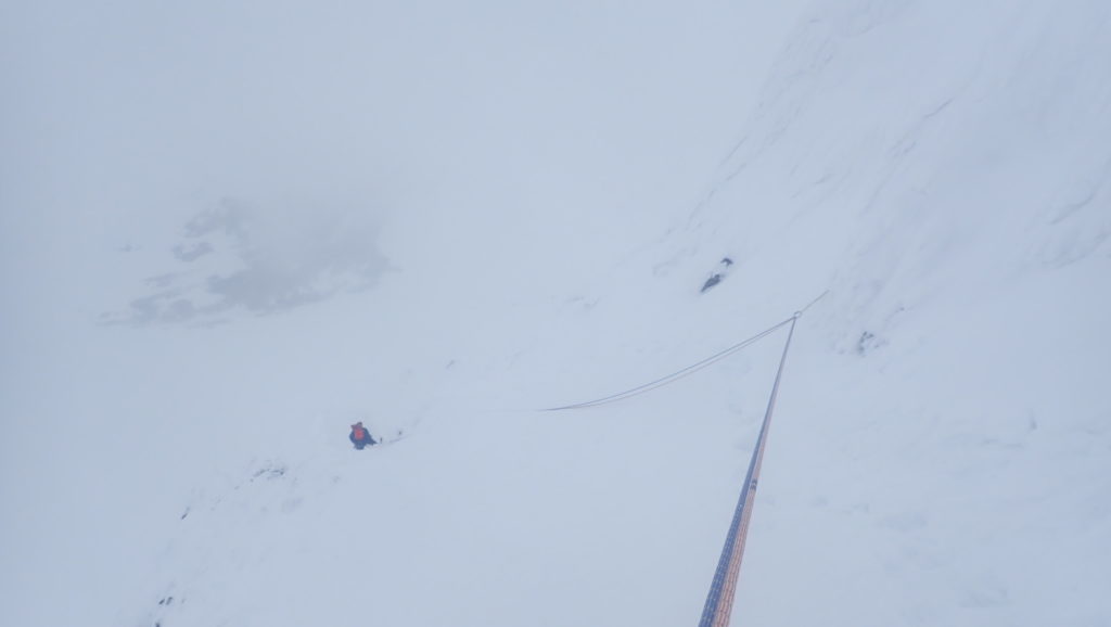 1時間後、左ルートにとっては3ピッチ目の雪壁を、同じ場所にアンカーとって
