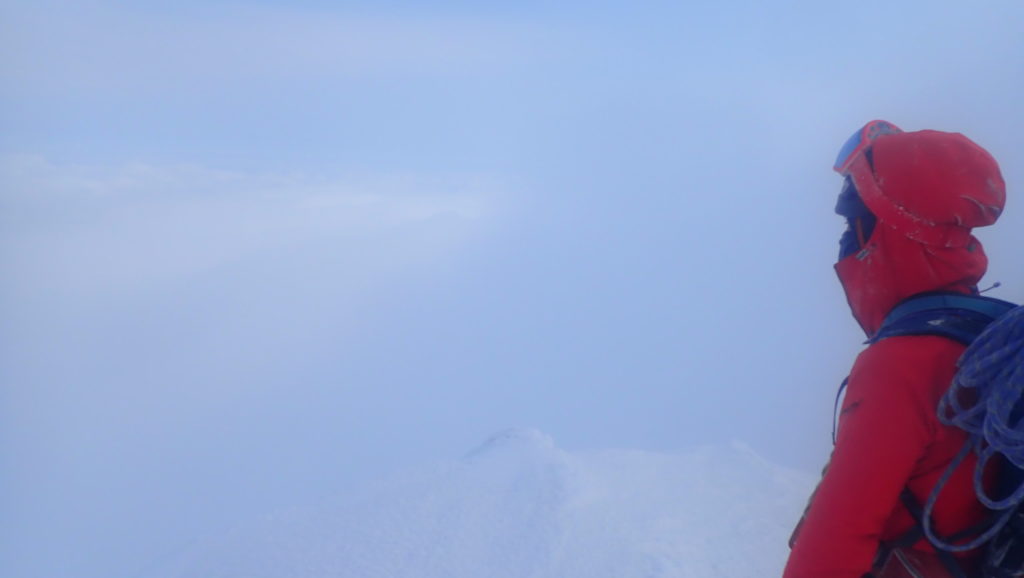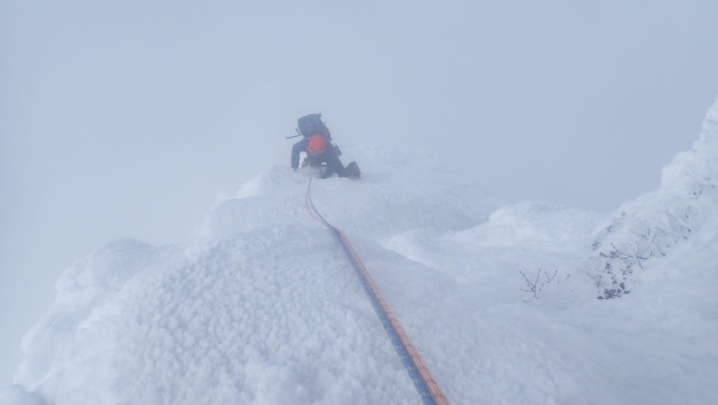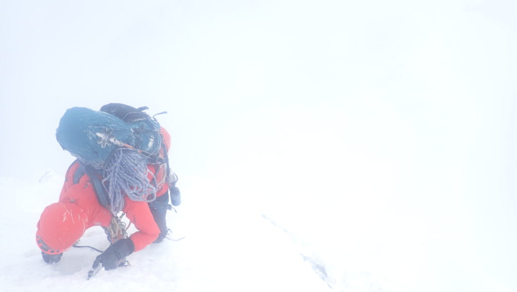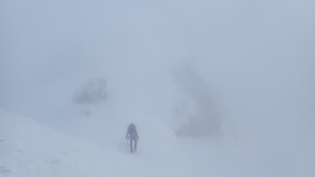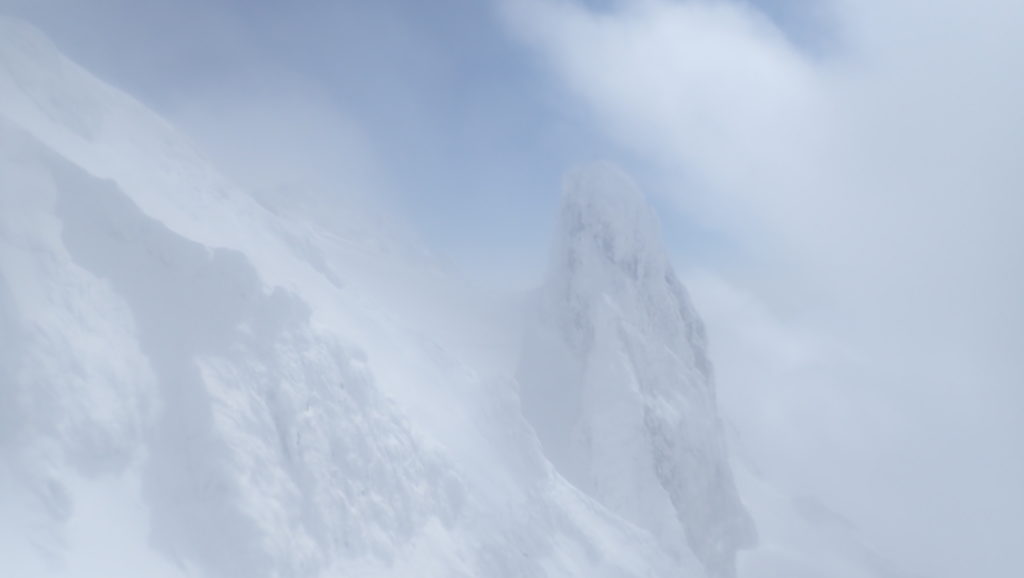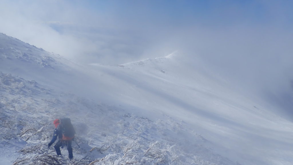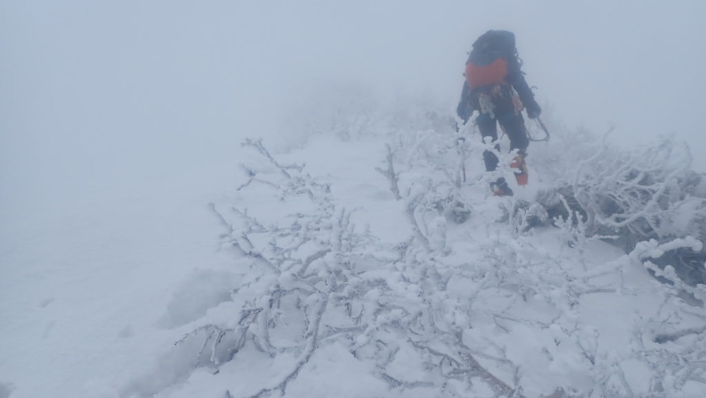 しばらくは雪稜歩き。強風・視界不良・雪の踏み抜き…と悪条件。