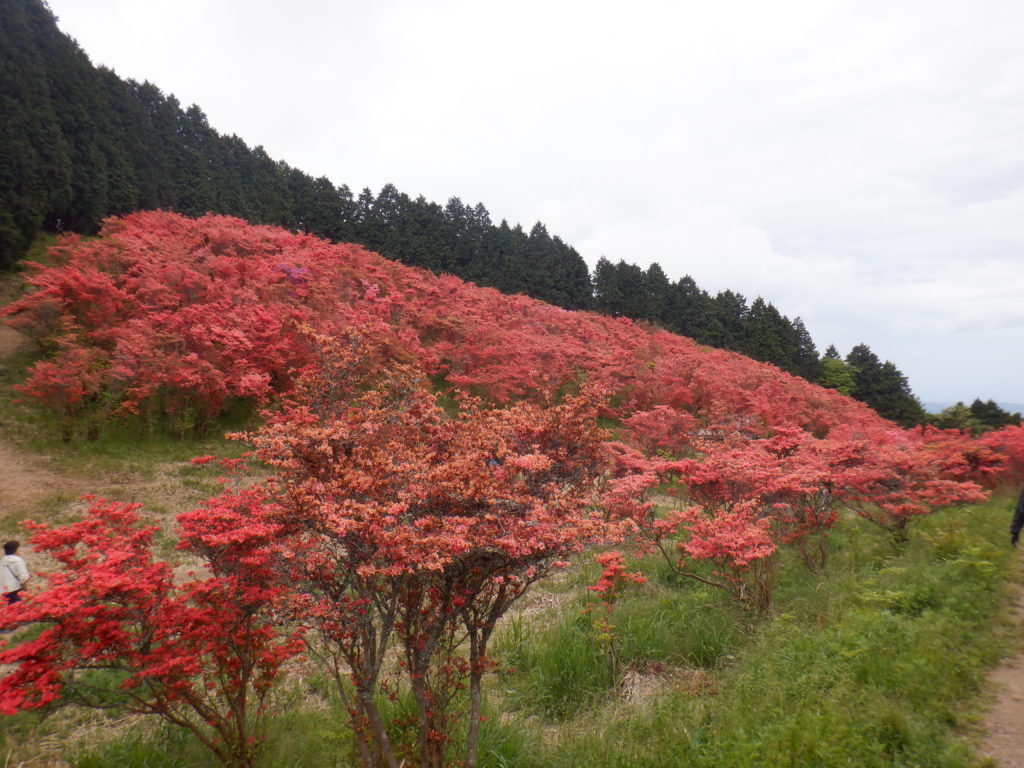 ヤマツツジで有名な大和葛城山、函館の恵山とどっちが綺麗かな?と期待しながら、水越峠登山口には朝6時過ぎに到着、日曜日ということもあり、すでに道路の片側の長い縦列駐車の隙間に潜り込みスタートしました。周回コースを時計周りに進みましたが、小川もあり、景色ありで変化があり気持ちの良い登りでした。下りは、景色なしで階段だらけでしたので、時計回りがおすすめです。登山道は整備されていて、快適な山行でした。期待のヤマツツジは近づくと、蕾がもう終わっているものも多く、何日か前がピークのようでした。