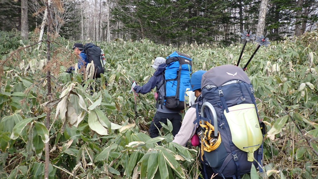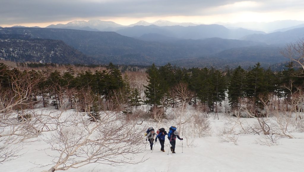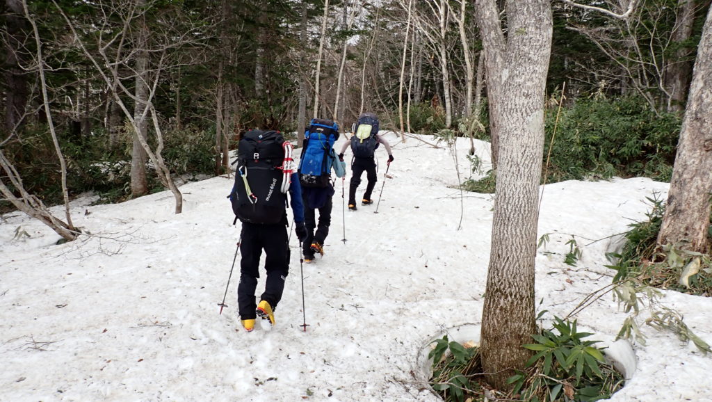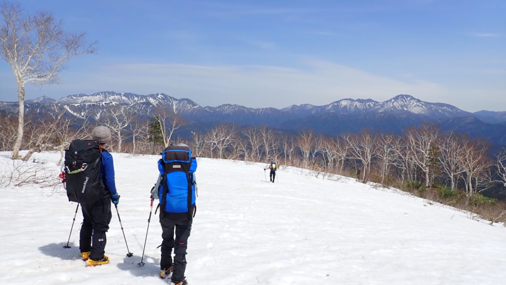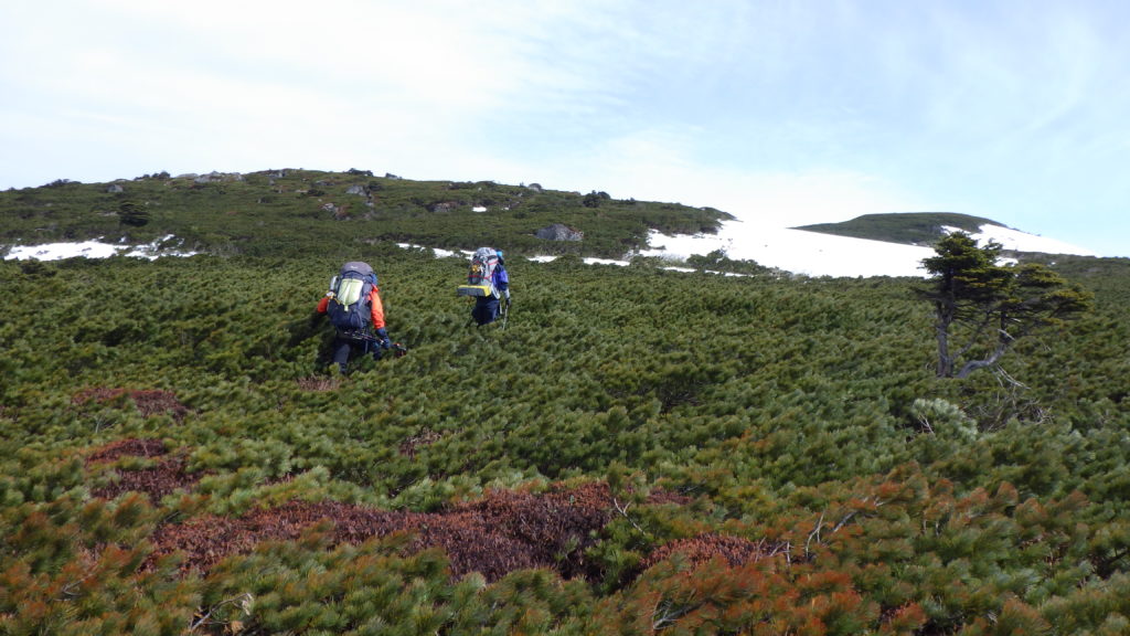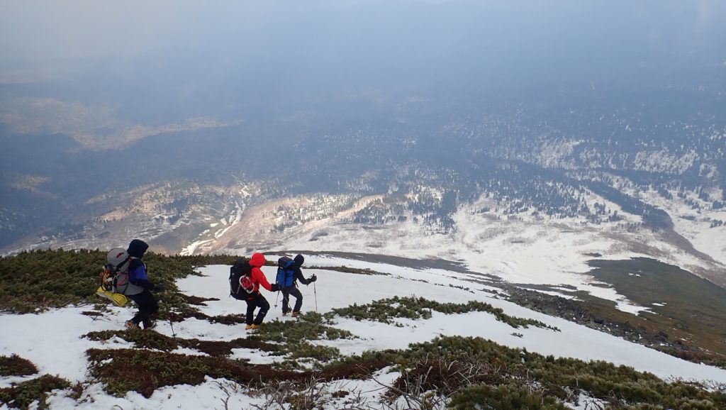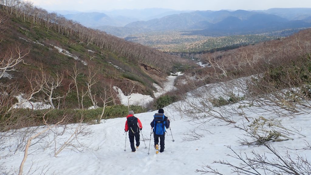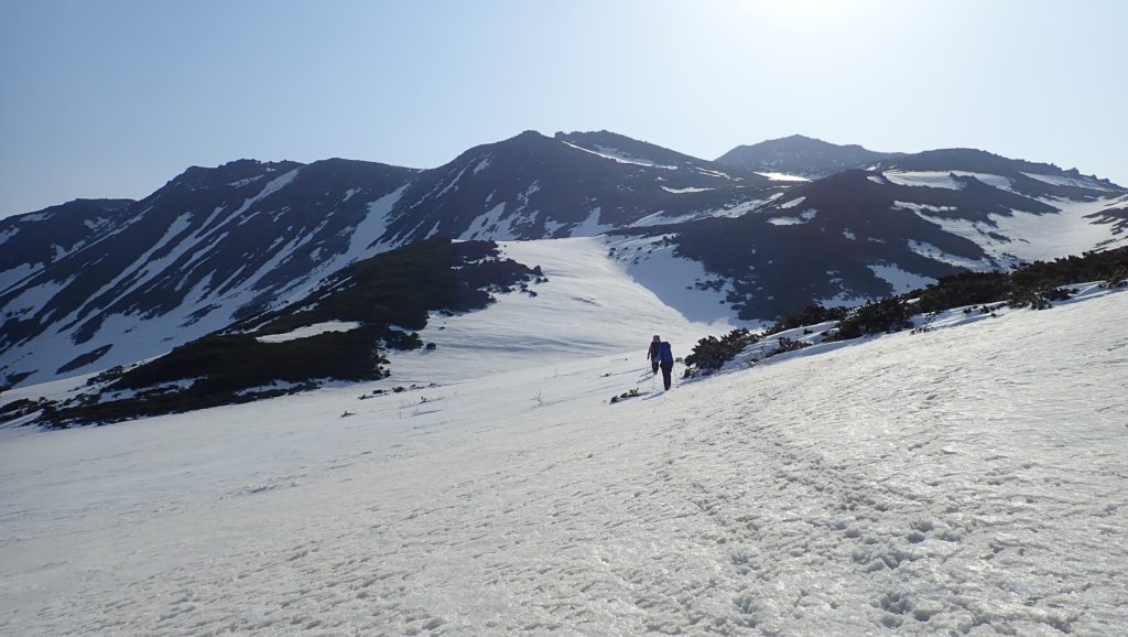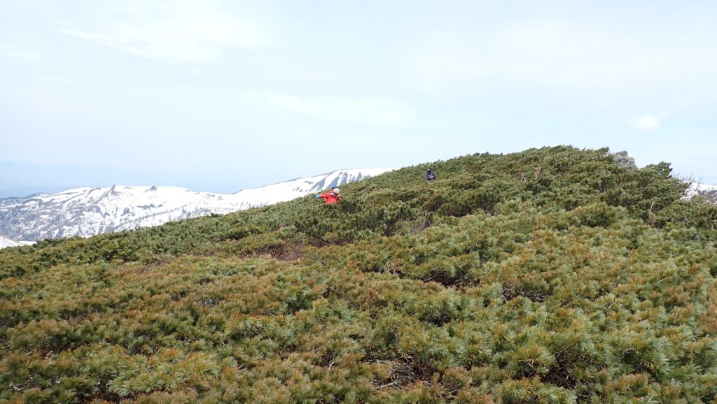 急斜面を登りきって稜線上です。背景は昨日踏んだツリガネ山