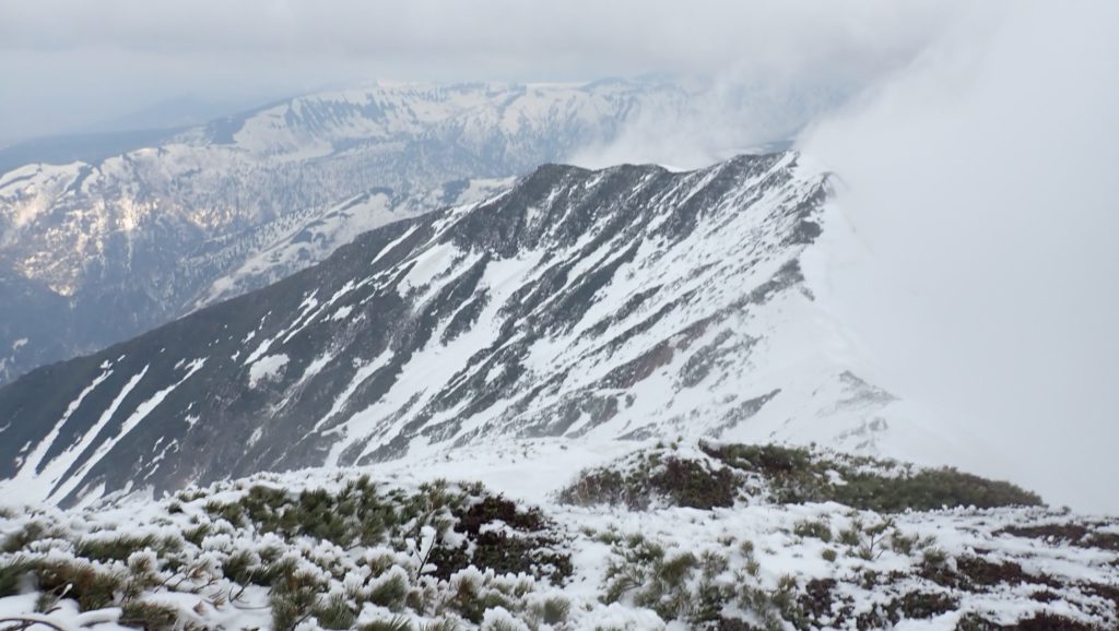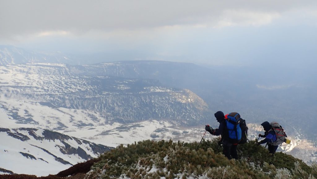 我々が向かうトムラウシ方面の痩せ尾根は、強風でこんな感じ