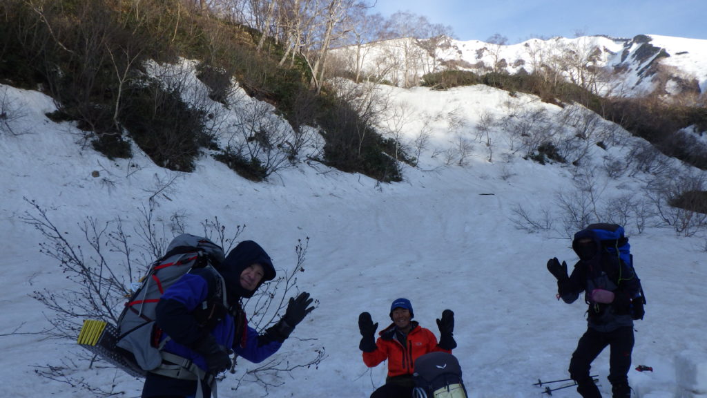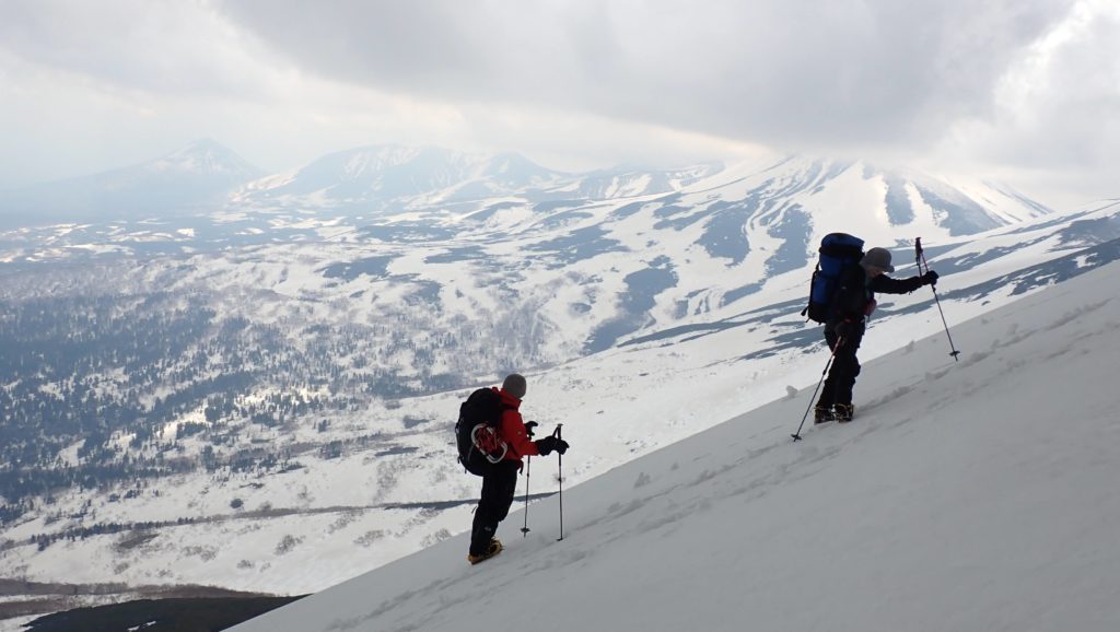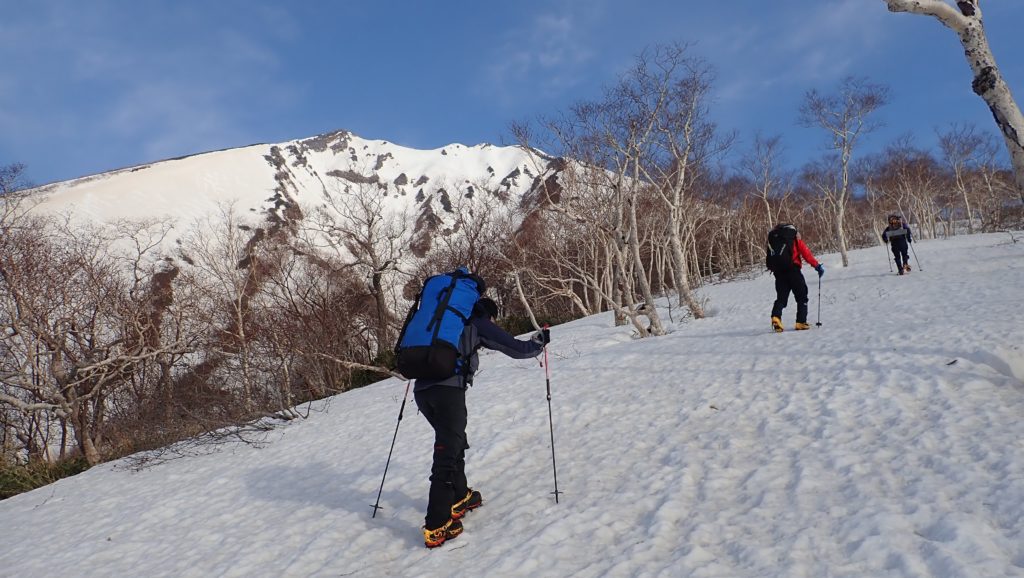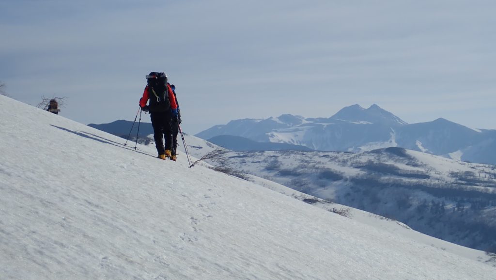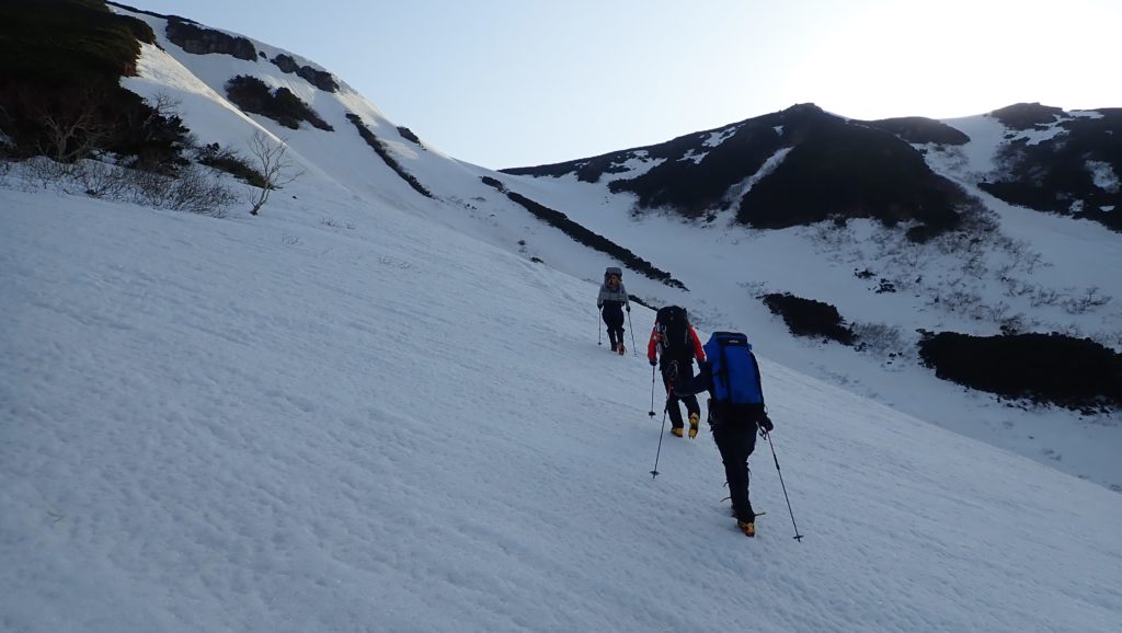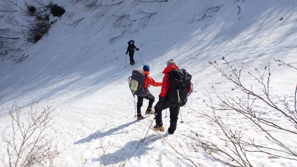 アイゼンを効かせて稜線を目指し登り返しました。スキーならこちらの尾根の方が楽しめそうでした。