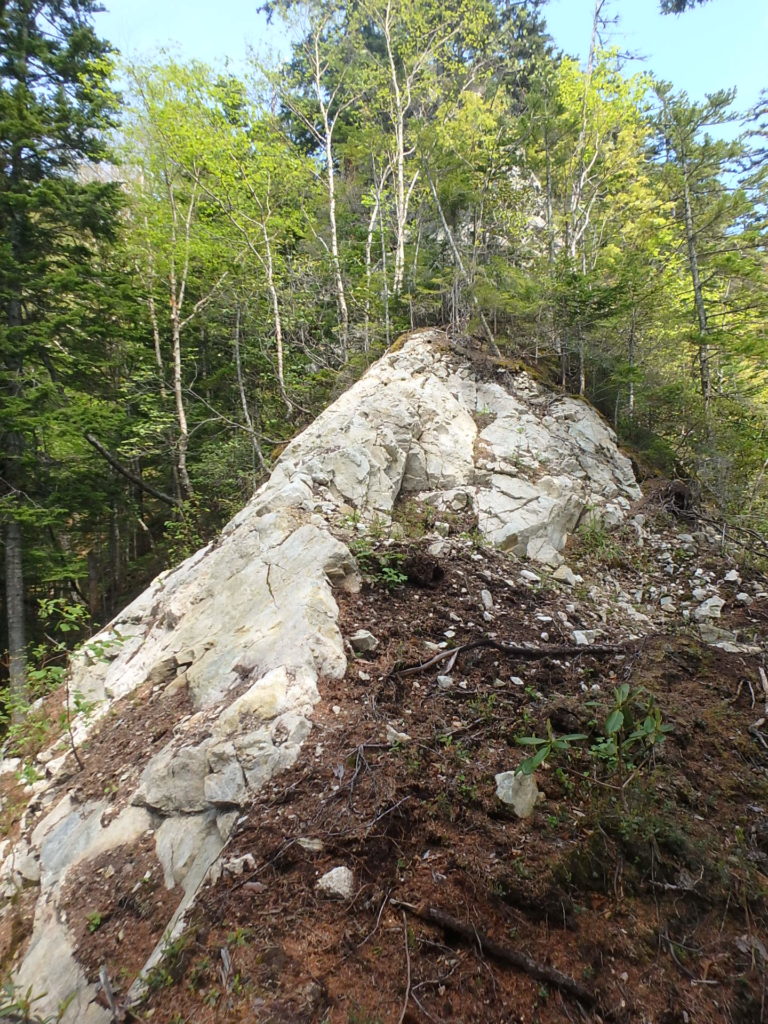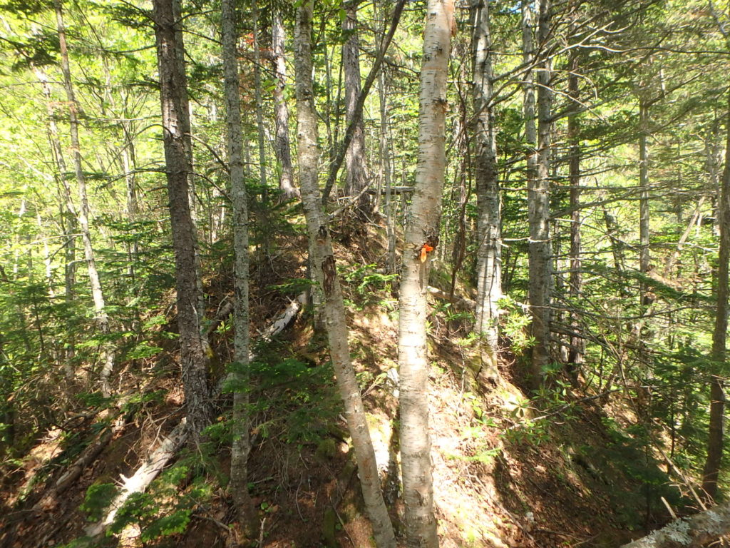 前述のパンケ支湧別林道610二股より左股を進む。地図では実線林道があるが跡形も無い。奥の尾根を使う予定でいたがやむを得ず橋からすぐの直登尾根から登る。尾根に乗ると長い倒木が道を塞ぎ進めないので途中から少し下がって急な斜面を斜上する事にする。800辺りの細い部分からは細尾根に乗り急登だがルートを見つけ登る。1020で真っ白な15mほどの岩が出てきて、一旦下がって巻きなおすか考えたが時間が無いのでここで下山とする。帰りは次回の為に800から沢型へ降りて隣の尾根の様子を偵察して下山。
