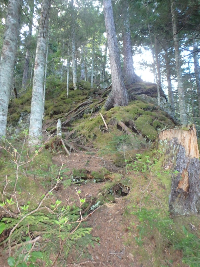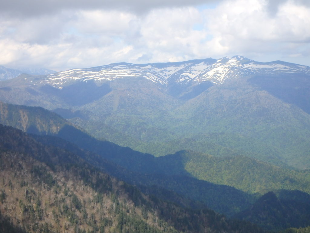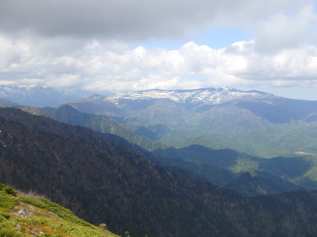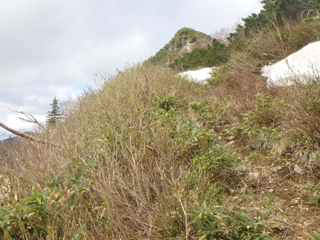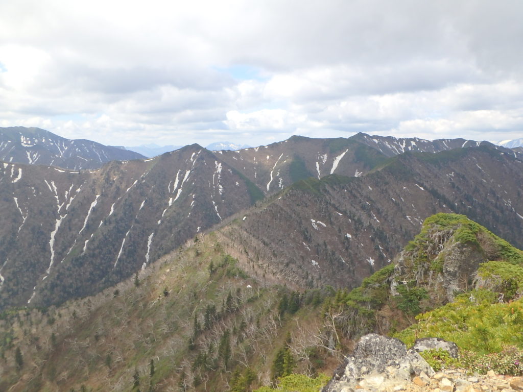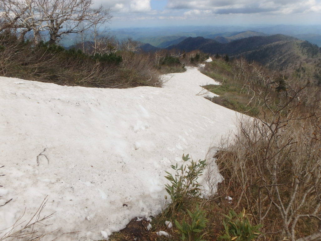 尾根取り付き(登山口看板)からすぐに右へ行き(左へ行っても合流するが右が近い)作業道跡を使い標高を上げる。820辺りで本格的な山道になり、稜線に上がる1610まで急な登りが続く。稜線から踏み跡と残った雪渓を使い山頂へ。山頂からは武利岳や天塩岳、遠く天塩山地の山並みが見える。