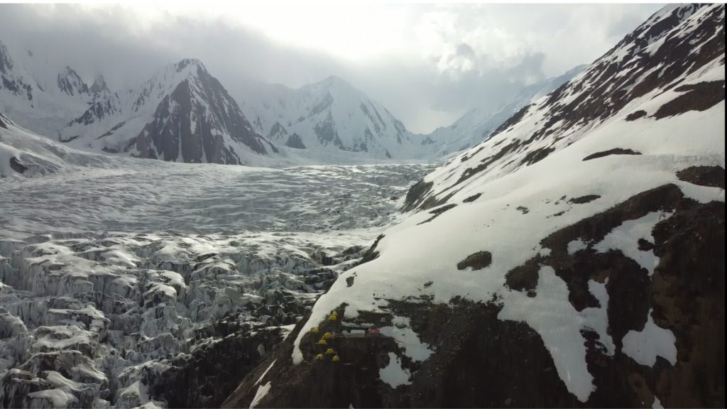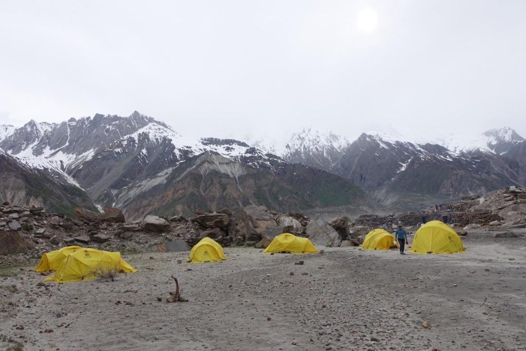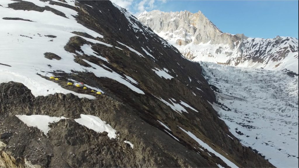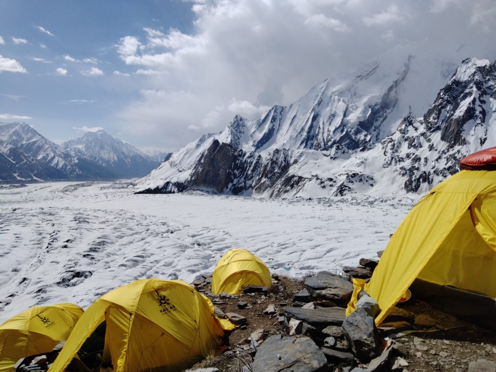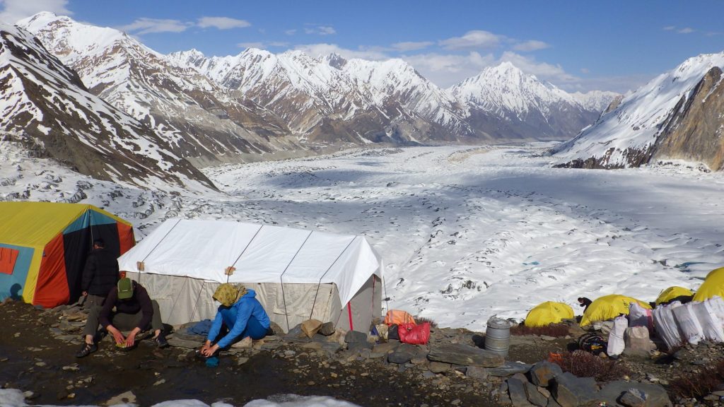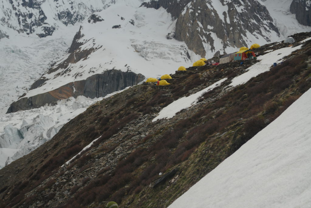 BCからチョゴルンマ氷河を見下ろす  約3週間過ごす個人テントは微妙に斜めだったり、ここって氷河に落ちないの?と思うような斜面ぎりぎりの場所もあり真剣じゃんけんで選びました