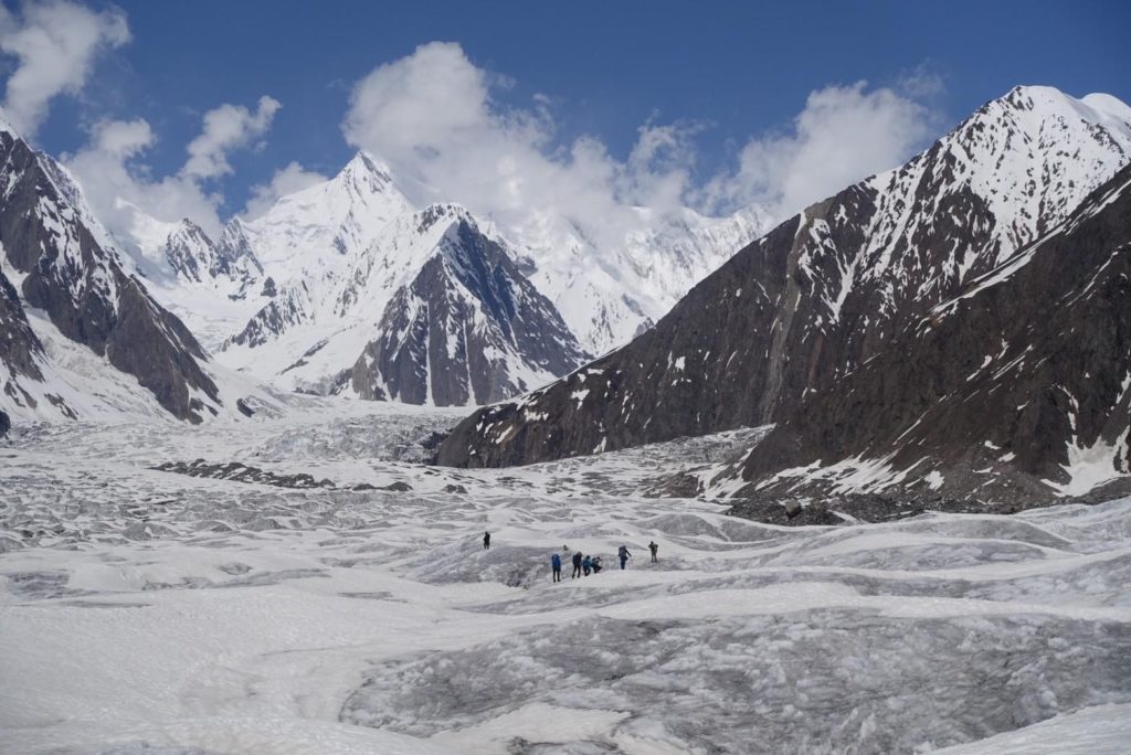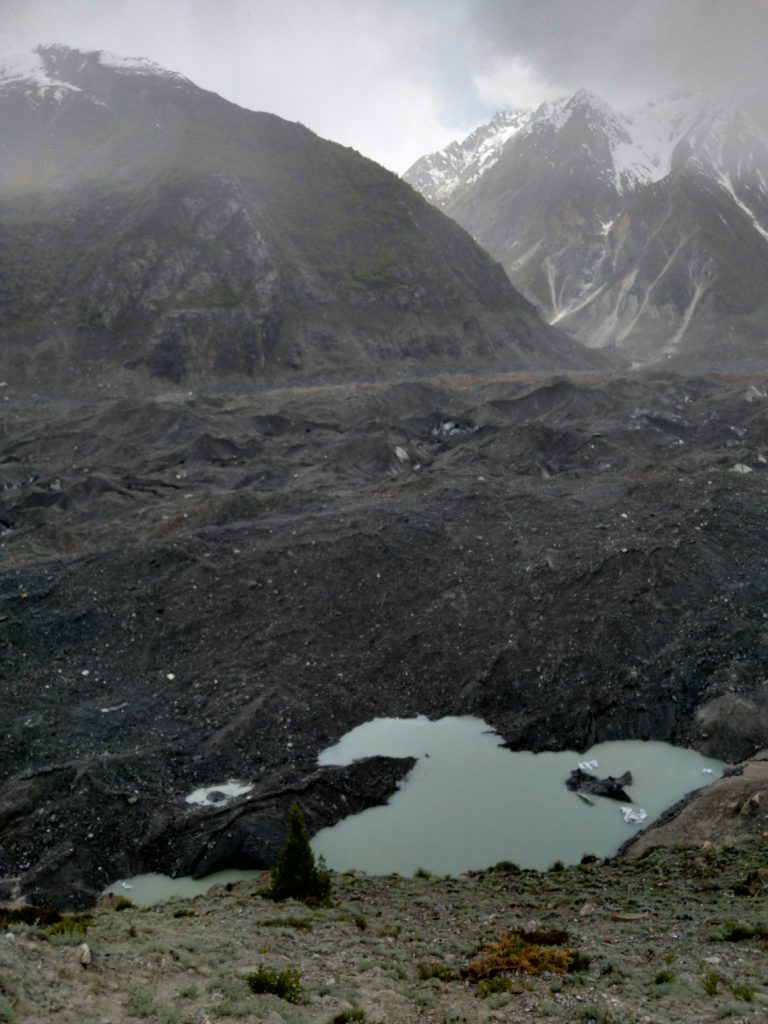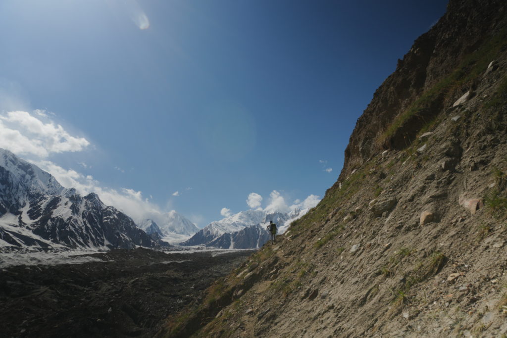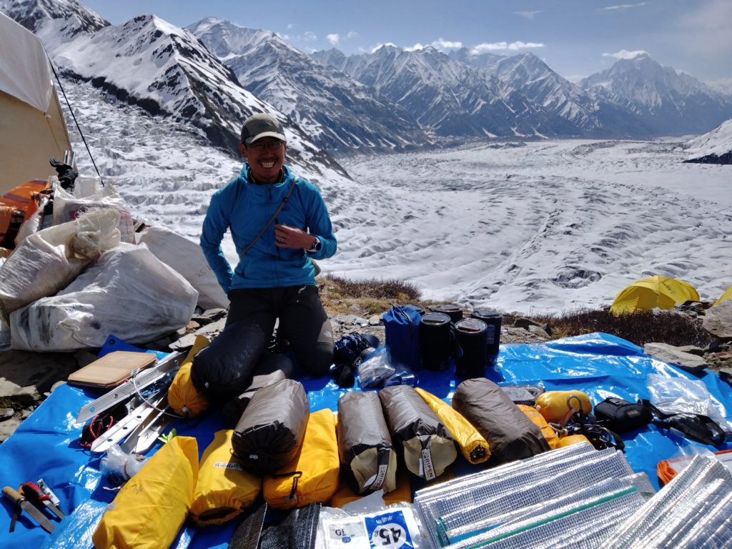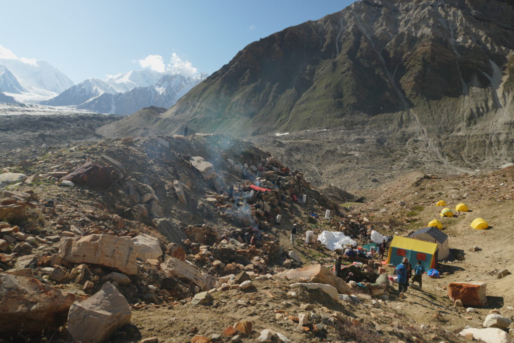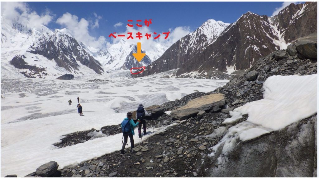 BCからチョゴルンマ氷河を見下ろす  約3週間過ごす個人テントは微妙に斜めだったり、ここって氷河に落ちないの?と思うような斜面ぎりぎりの場所もあり真剣じゃんけんで選びました