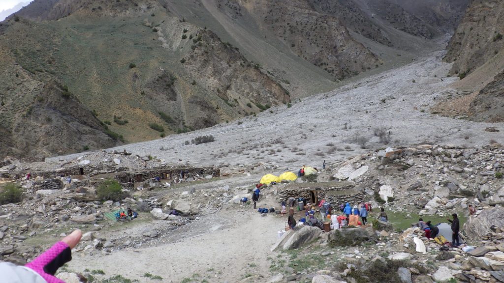 歩きの早いポーターさんたちがBCに荷物を置いて引き返してきました