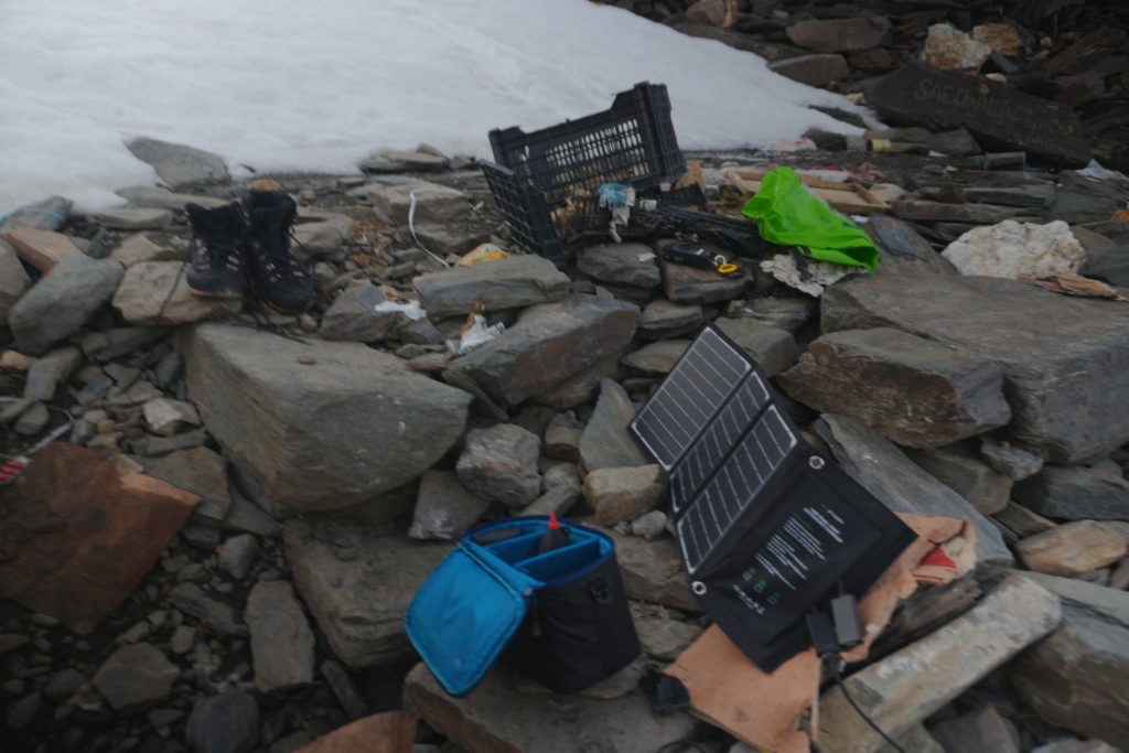 カメラ、衛星携帯、ヘッドランプなどいろいろな機器の充電が必要になります。モンベルのソーラーパネル二つと会員からお借りしたもの計三つ持ち込み、日差しの強い時を狙って充電をしました