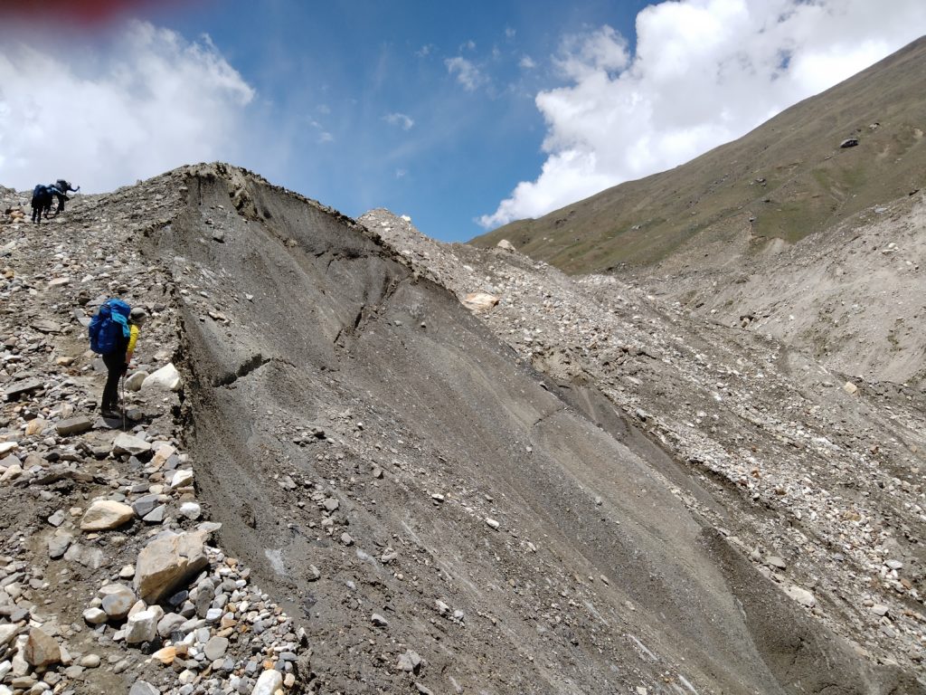 氷河上のモレーン(氷河が動くときに削ってきた山肌の石)の上はすごく歩き難かったです