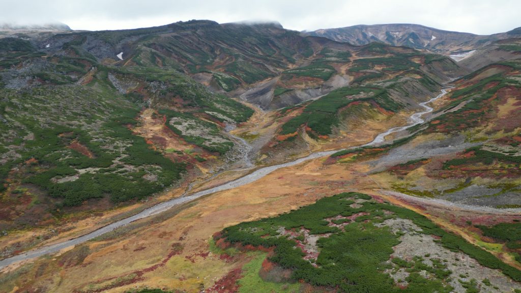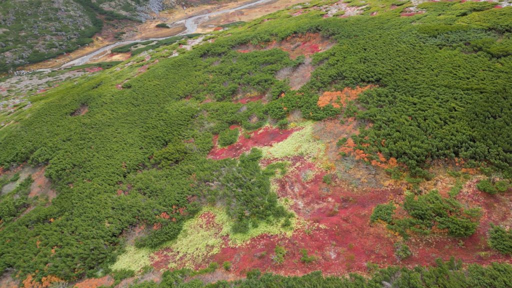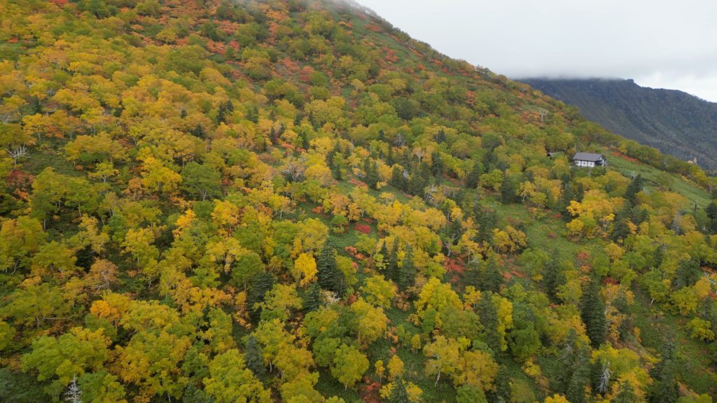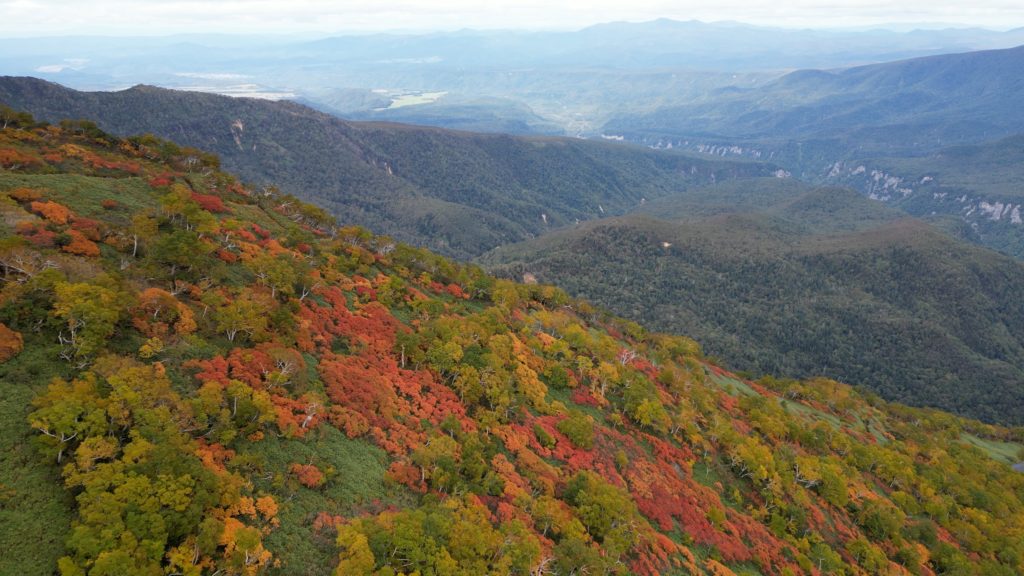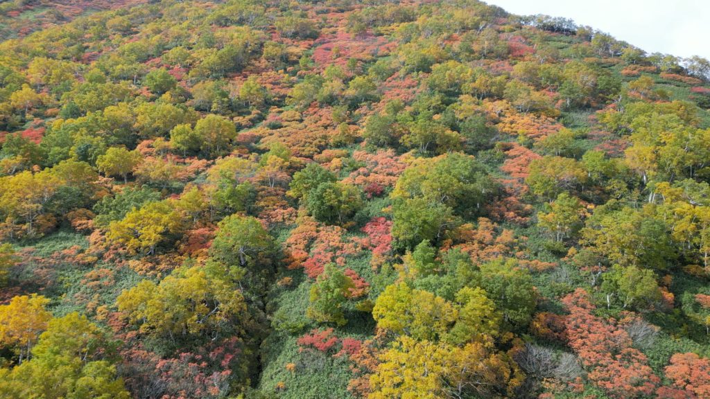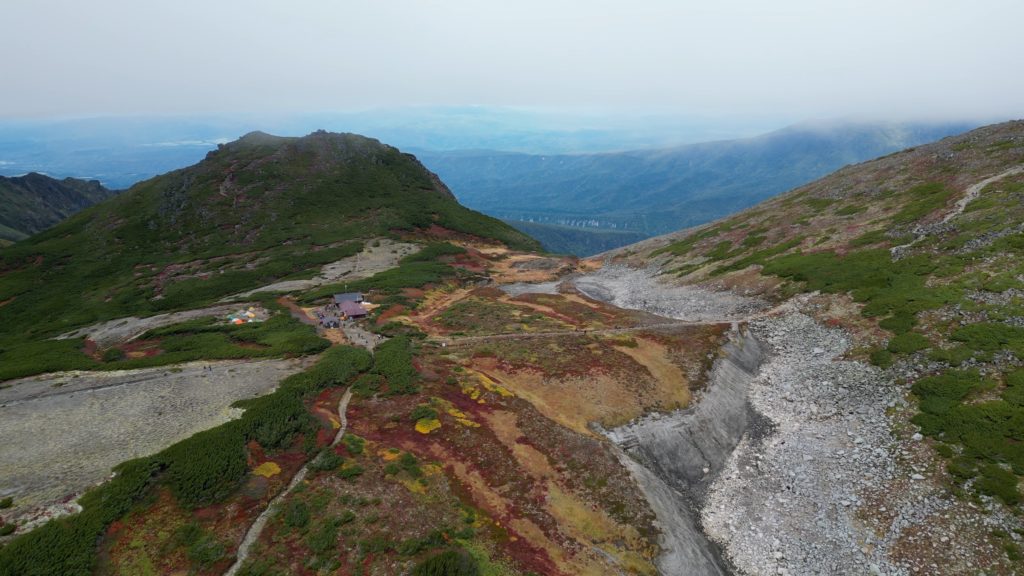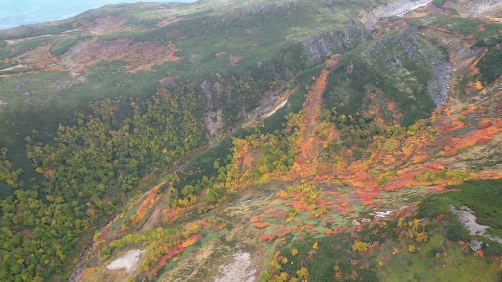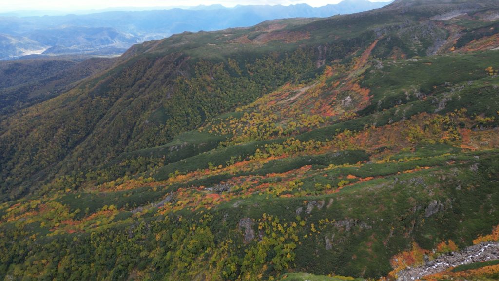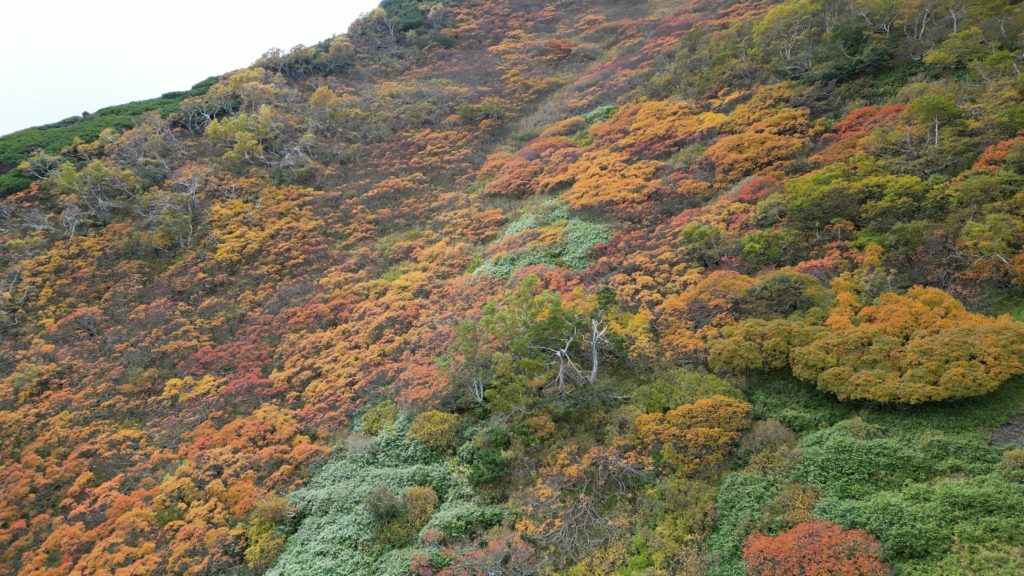 この日は、紅葉狩りの観光客や登山者で登山道が渋滞していました。早朝はガスで視界がありませんでしたが徐々にガスも上がりました。日本一早い紅葉はいい具合に色づいていました。昨年より色づきはよかったものの、山頂近辺の山肌は数年前にくらべるとあまりぱっとしませんでした。山頂からお鉢にかけてもすっかり秋色でした。
