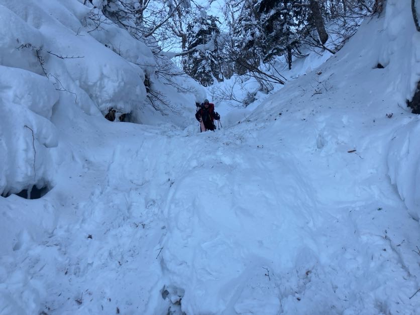 1/25 6:30奥漁川橋P発→7:50尾根取り付き→11:45漁岳山頂→16:00幕営