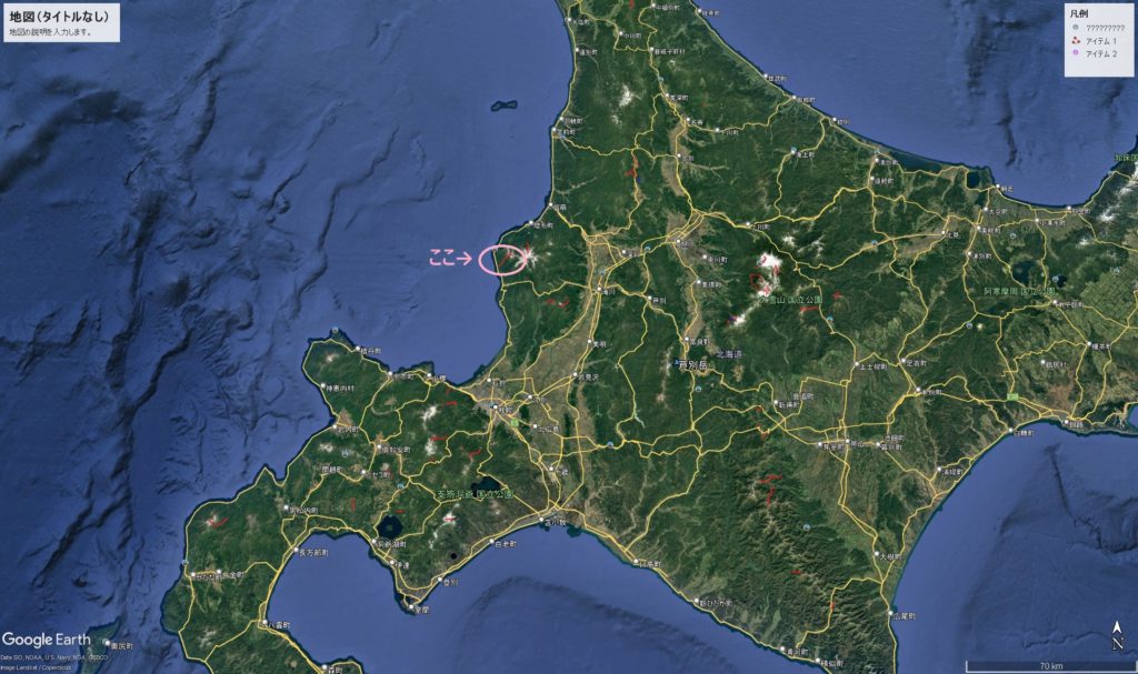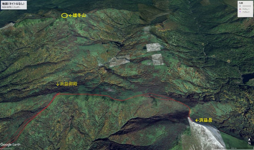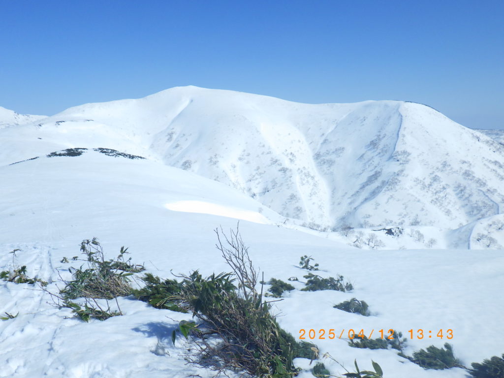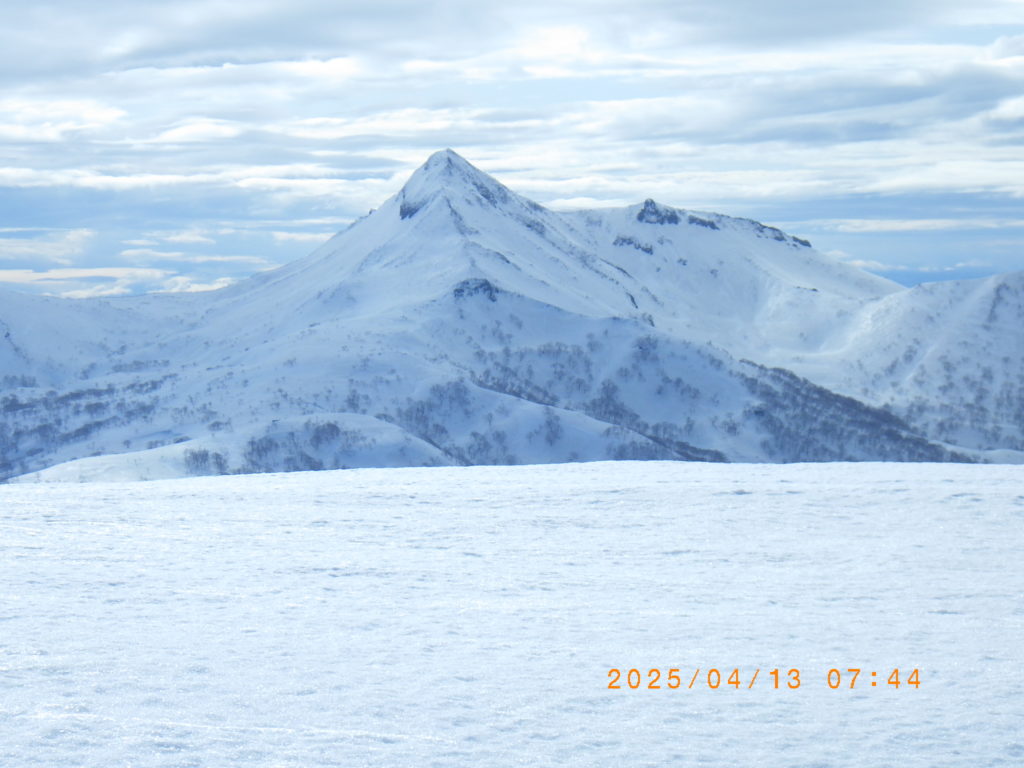 右に浜益岳。青空に真っ白い山