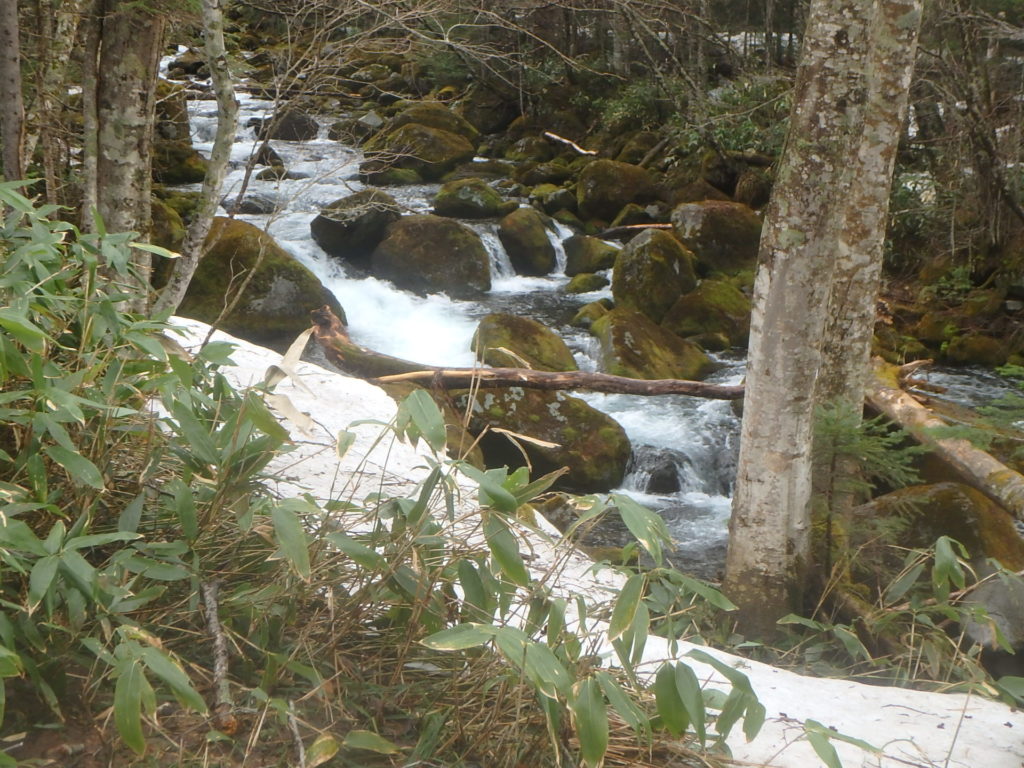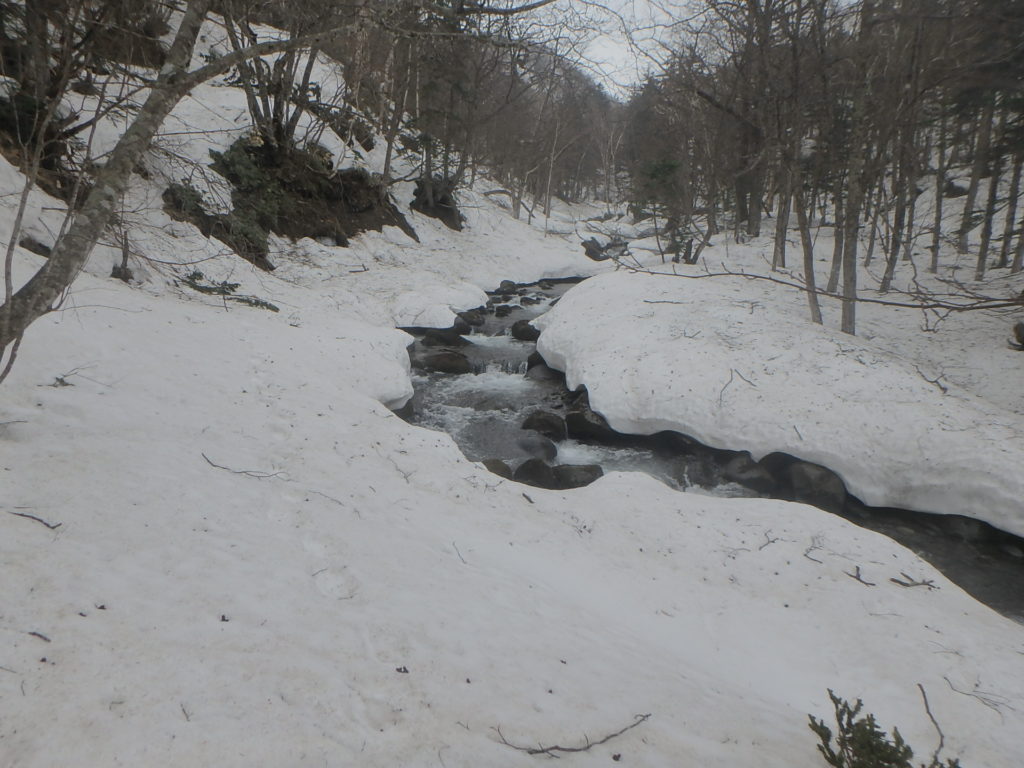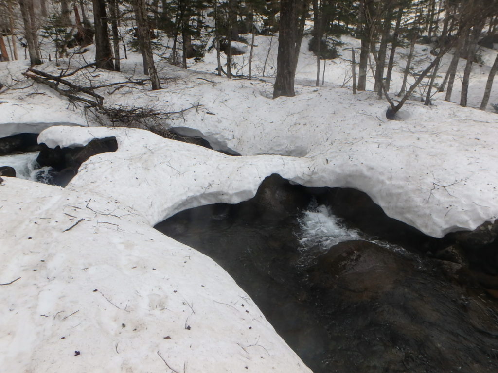 尾根に取り付き1本目の沢は雪がありました。2本目のタテヤ沢にはすでに雪が無く川岸を上流、下流と探し、一つだけ残っていたスノーブリッジを渡りました。CO875辺りには3~4mの滝があります。CO850にあったスノーブリッジを渡りました。