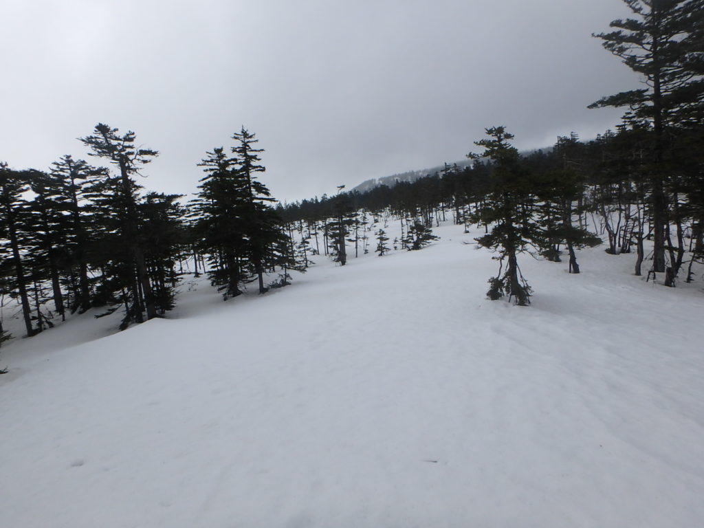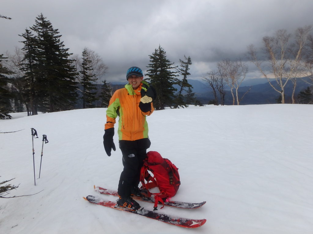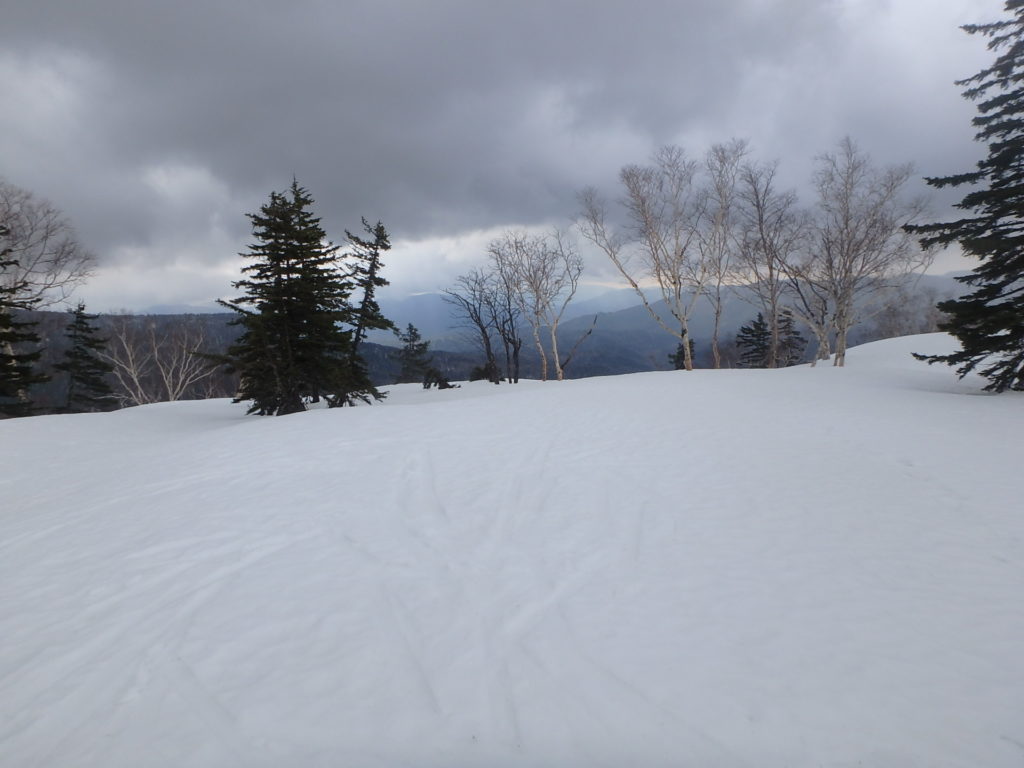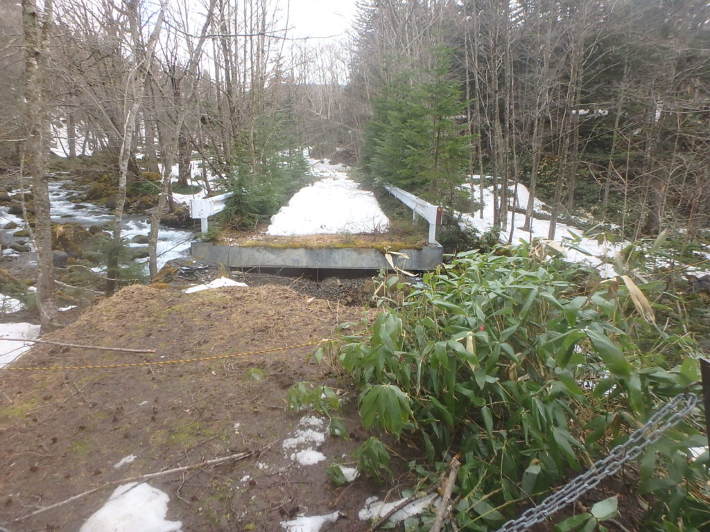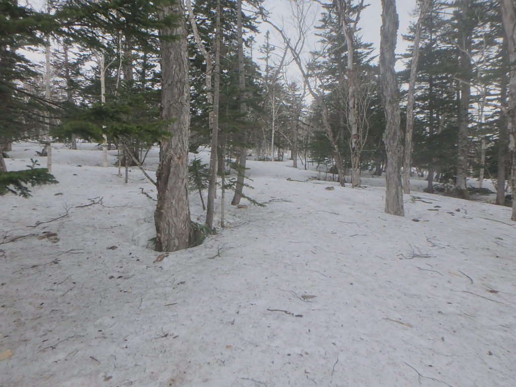 かねてから登ってみたかったトノカリシベツ山に登ってきました。今シーズン何度か林道の偵察、天候状況を見ながら登る機会を伺っていましたが、なかなか機会が無くGWに行く事にしました。林道は雪も消えていて問題なく走行出来ましたが倒木が2本あり、処理するのに時間がかかりました。三股橋手前約1Kmのところに駐車スペースを見つけ、そこをスタート地点としました。シートラで10分ほど歩くと雪が繋がっていて雨量観測所を通り、一つ目の沢を渡り二つ目のタテヤ沢にあったスノーブリッジを渡り、トノカリシベツ山へと続く尾根に取り付きました。 タテヤ沢に1ケ所だけ残されていた薄いスノーブリッジを渡るのが今回の山行の核心部でした。山頂へと続く高層湿原の台地に登った時には風とガスで期待していた展望を得る事は出来ませんでしたが、充分満足の出来る山行となりました。