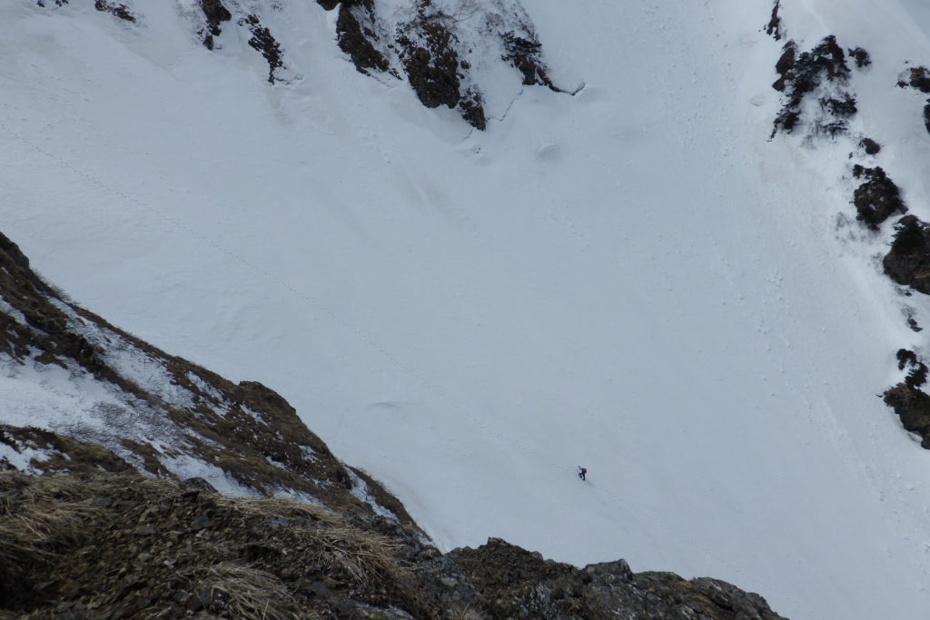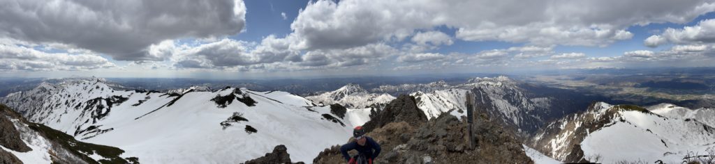 連休後半に芦別岳一稜を登った。一稜アタック日は、ピーカンの天気。サングラスを忘れた目には辛い照り返しだった。 一稜取り付きまでは、体力勝負。息も絶え絶えに一歩一歩積み重ねての登り。取り付き手前で登る沢を間違って、少しだけ回り道。 一稜は、山谷の記録どおりに1P目と最終ピッチのみロープを出すことを想定して取り付いた。1P目は稜線に上がるまで。ボロイ3mほどのガレた壁を灌木にランニングを取りながら登り、雪壁につなげて稜線まで登る。取り付きから45mほどロープを延ばした。 山谷には、この後ロープを解いて急傾斜の灌木帯を登り、山頂直下の3級10mほどの露岩でロープを出すと記録されていたので、記述どおりロープを解いて、メンバー思い思いに登った。灌木やハイマツがあり、バイルも概ね小気味良く効いたが、ロープが欲しいところは少なくなかった。途中1か所ロープを出したが、山頂直下はロープを出さなかった。山頂直下の3級10mほどの露岩ってどこだったのだろうというのがメンバーの共通意見。 ピークからは360度のパノラマを拝むことができた。 計画では本谷を下降することにしていたが、登行時の左岸側の落雪塊や落石の状況を踏まえて、覚太郎尾根下降に変更。ユーフレ小屋にデポした宿泊装備を回収して登山口へ。 昨年同時期に登った五稜に比べて、確かにすっきりと心地良い稜だった。お天気と良い仲間にも恵まれて、一稜を完登することができ、久しぶりに疲労の中からフツフツ沸いてくる心地よい充実感を感じることができた。メンバーの皆さま、ありがとうございます。
