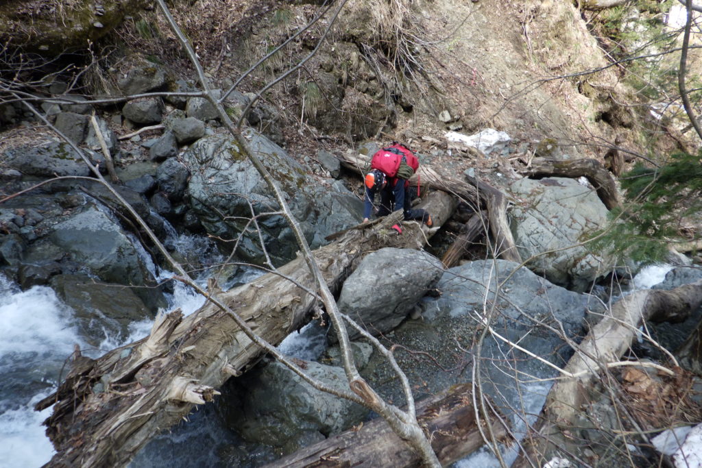 ユーフレ小屋と旧道分岐の手前c520m付近の沢に架かっている倒木渡り