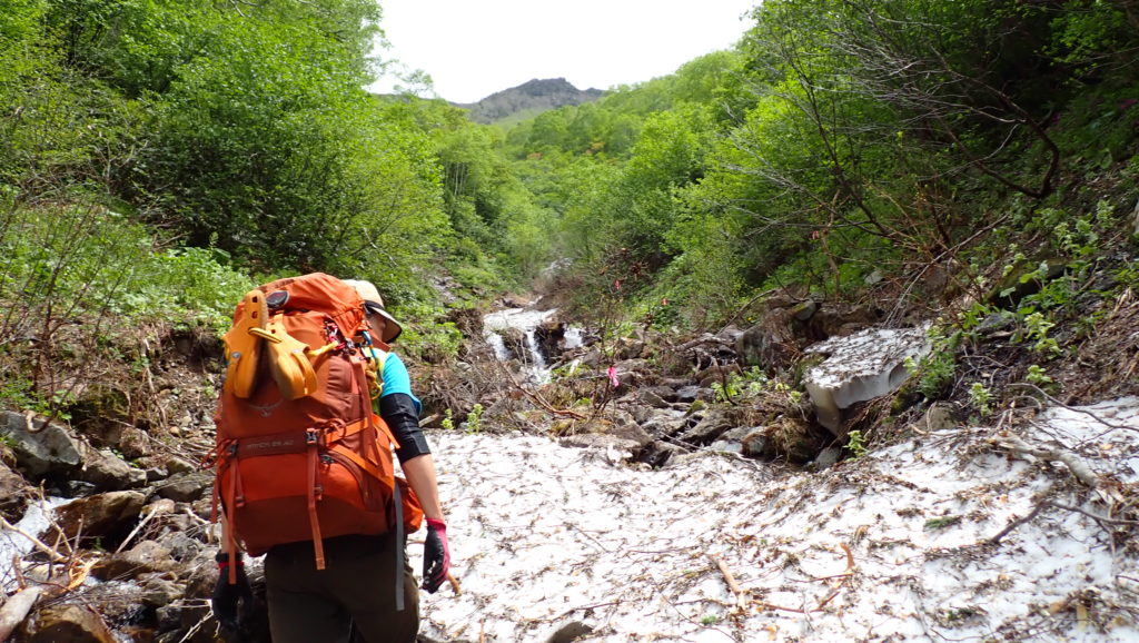 終始沢靴で行動したので雪渓歩きは緊張しましたが、クールダウンできて結果オーライ!雪解けで沢の水量は多めでした。