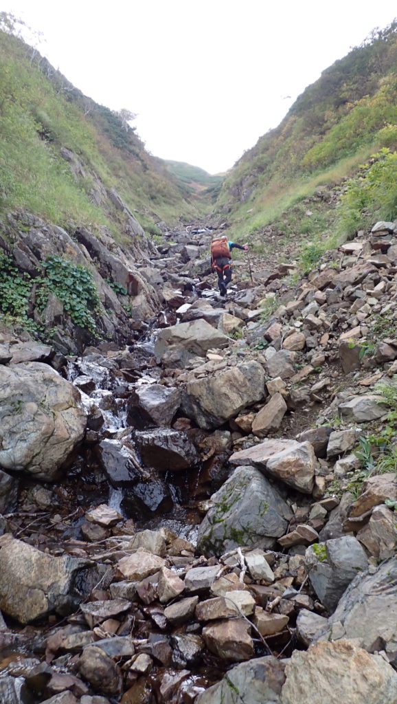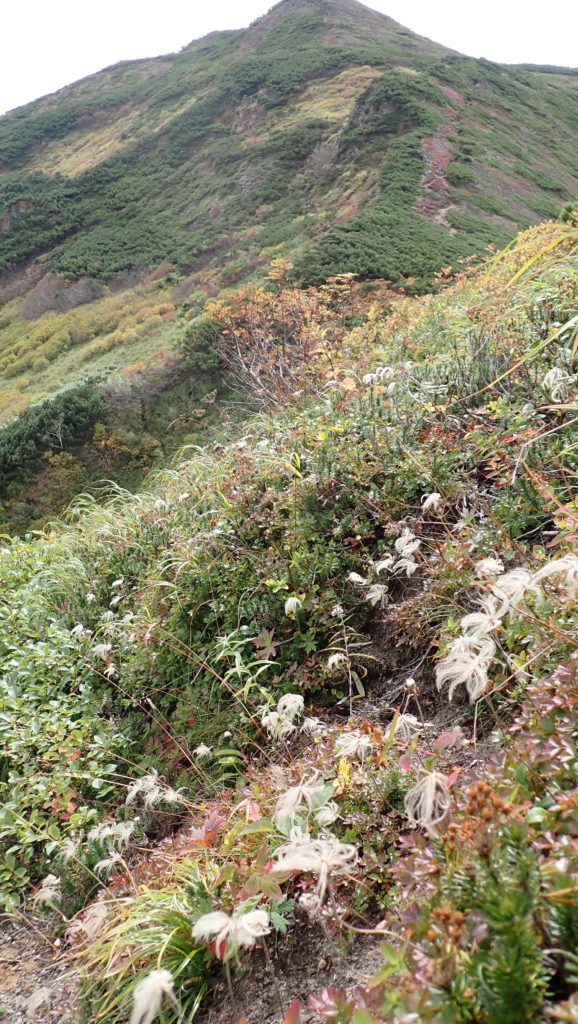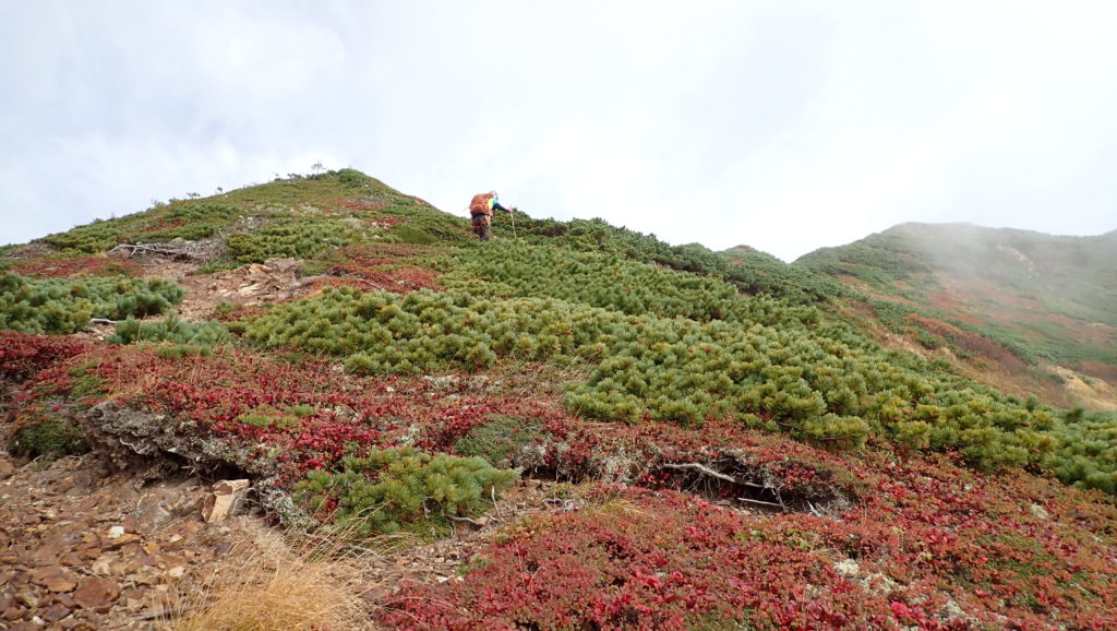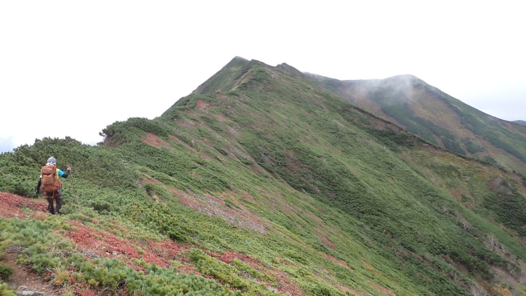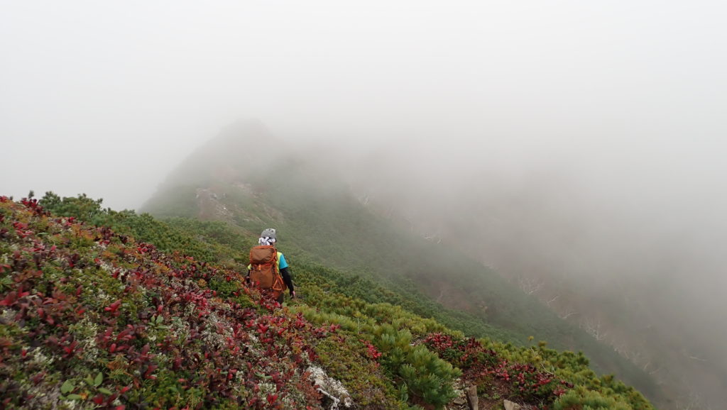 稜線に出た時はまだ眺望もありましたが、徐々にガスに包まれて幕営地につく頃には小雨が降り始めました。その日の晩は道内各地で大荒れ。タイミング良く歩けて良かったです。