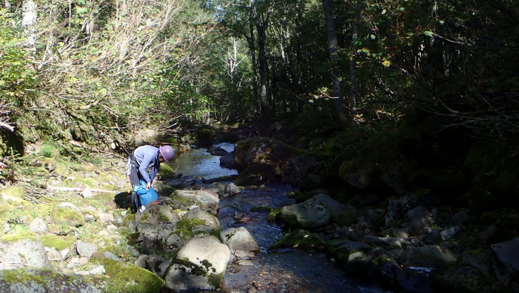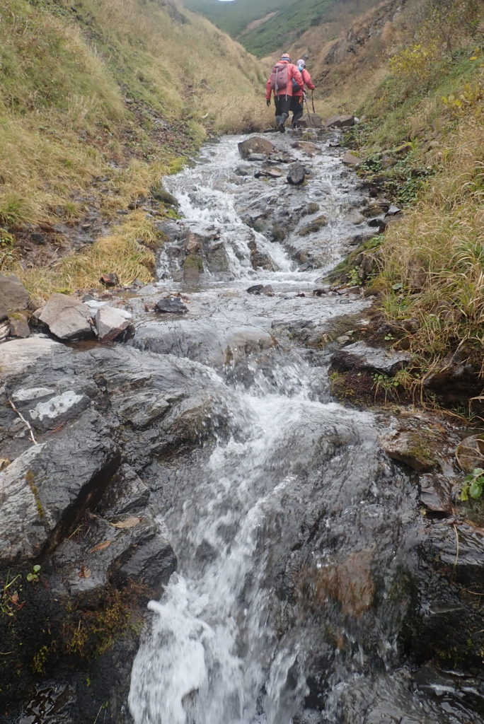 途中で硫黄の鉱泉が出ているようで、川底が白っぽい箇所がありました。左からの流れ込みは普通の水質です。