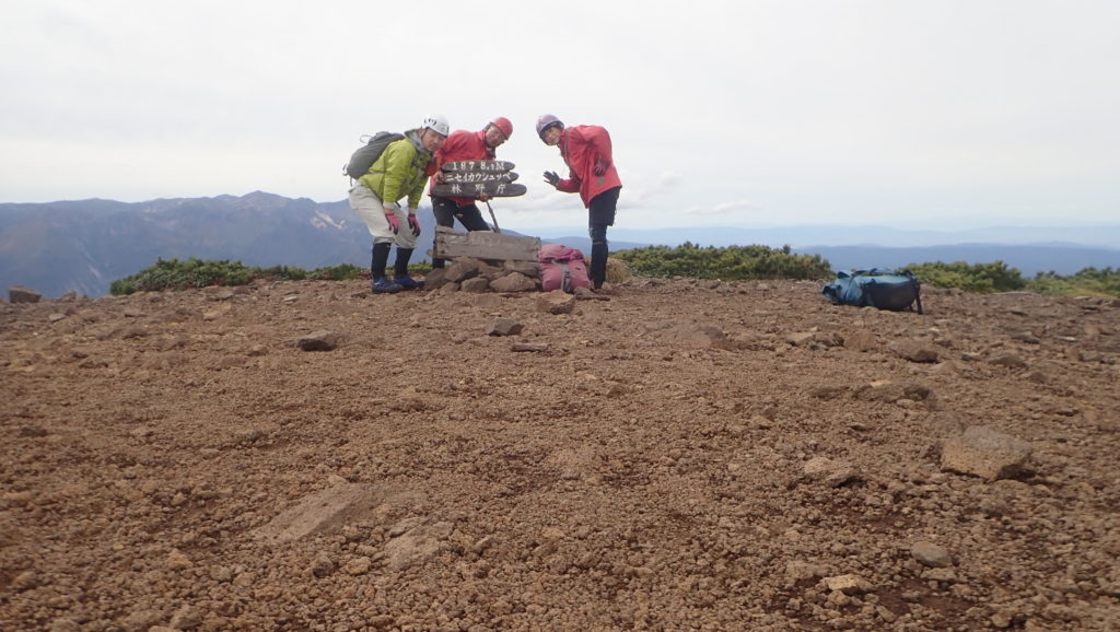 藪漕ぎもなく夏道に合流 10~20分ほどで頂上です。下り坂の予報でしたが、大雪山や有明山などが見られました。