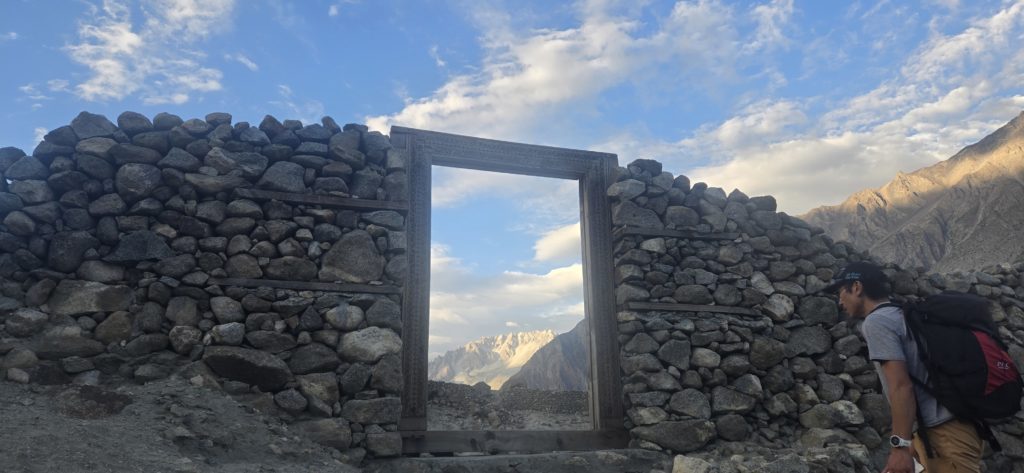 ラカポシ山(ガスで頂上は見えませんが)の氷河から流れる川。フンザ渓谷。近くまで行くと寒いくらい。レストランやカフェなどもあり寛いでいる観光客が多かったです。