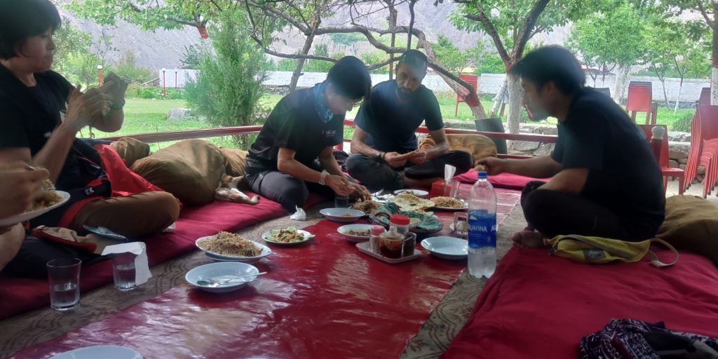 ギルギットのジャグロットという場所にあるレストランで遅めのランチ。庭園の中に寛げるスペースが何か所もあってパキスタンと中華が混ざった感じのメニュー。人懐こい華奢な猫もいて長いドライブで疲れた我々を癒してくれました。