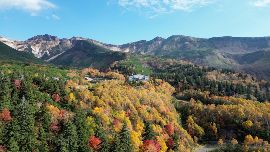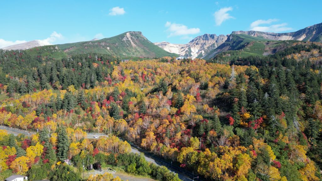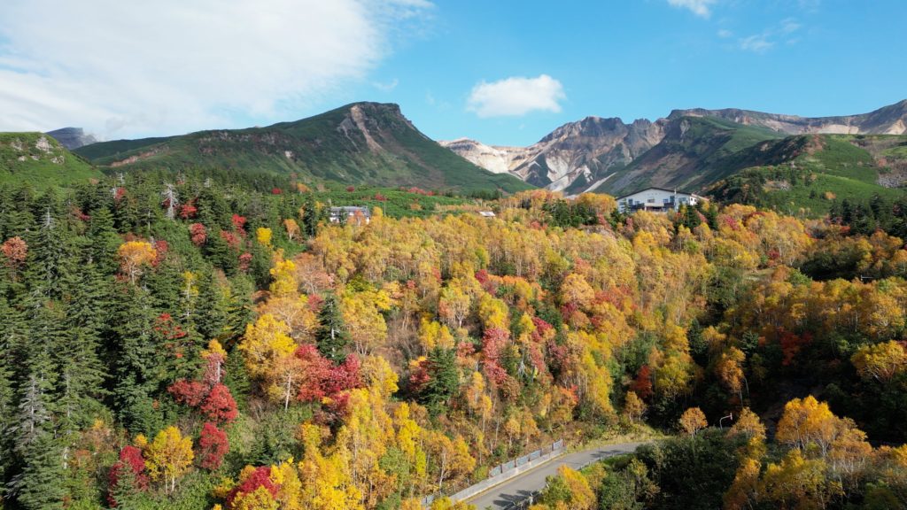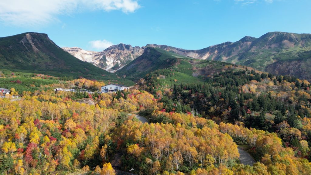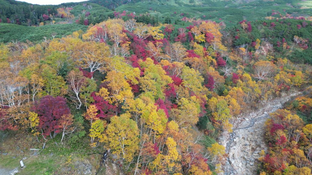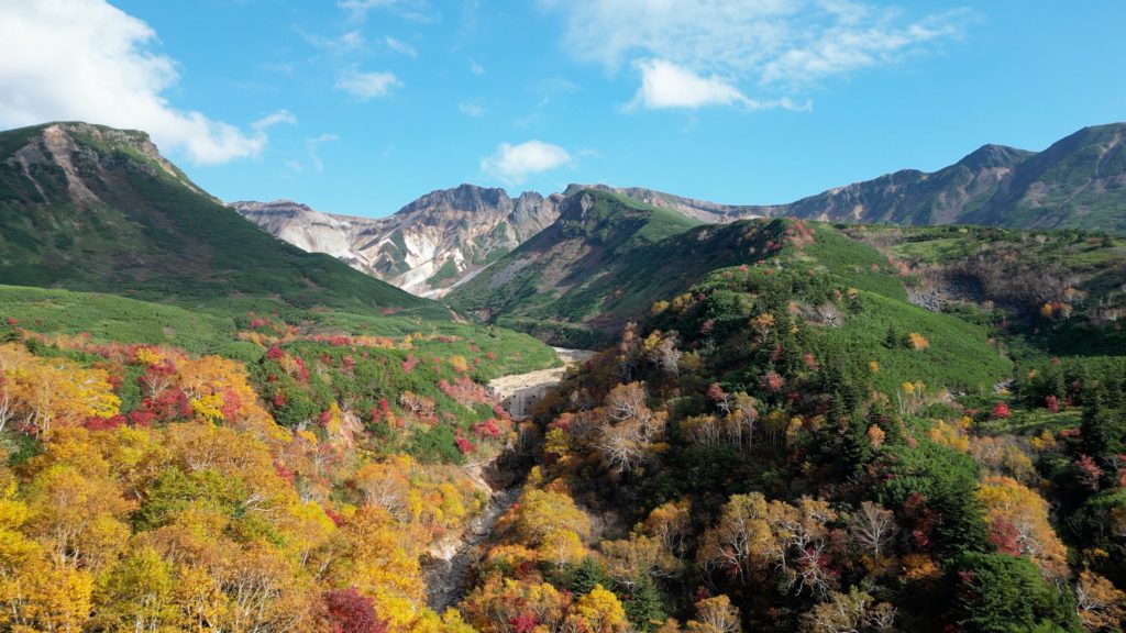 紅葉狩りを兼ねて、十勝岳温泉からピストンしました。短時間でしたが気持ちよく歩くことができました。登山口周りの紅葉はピークを迎えていました。大雪山系・十勝岳連峰のふもとにある十勝岳温泉郷の紅葉はいま見ごろを迎えています。十勝岳温泉郷の背景にあり、三段山、上ホロカメットク山、上富良野岳に囲まれる谷間地肌むき出しの荒々しい岩壁、侵食で深く切れ込んだ谷は、ヌッカクシ火口(安政火口)と呼ばれ過去にあった火山の大爆発によってできた十勝岳連峰を実感できます。ふもとの紅葉と背景の十勝岳連峰が調和して、美しい景色を見せてくれています。上ホロカメットク山の山頂からの映像では、十勝岳連峰の美しい風景を見ることができます。