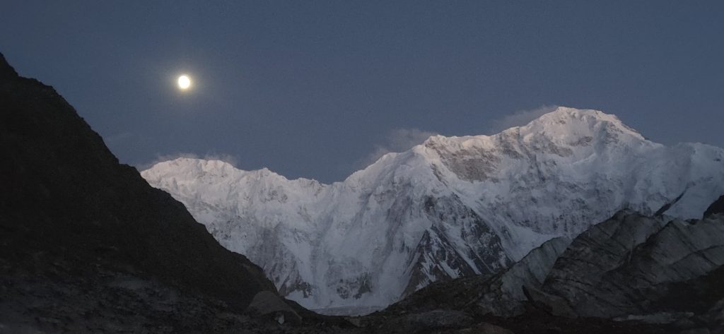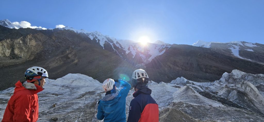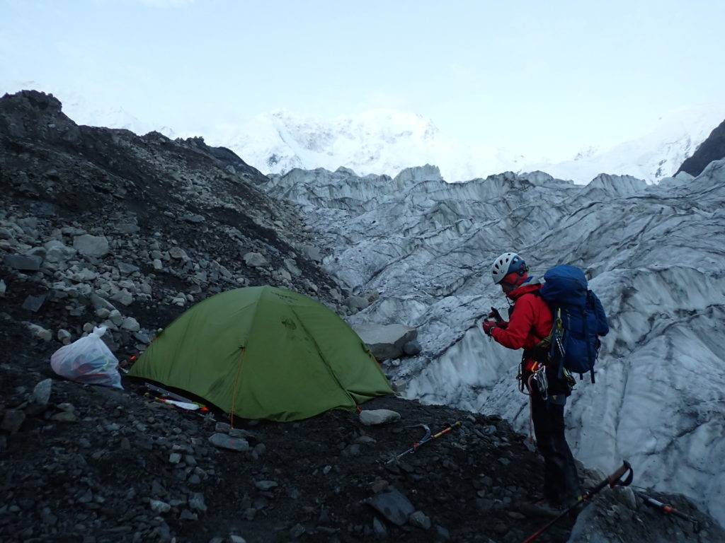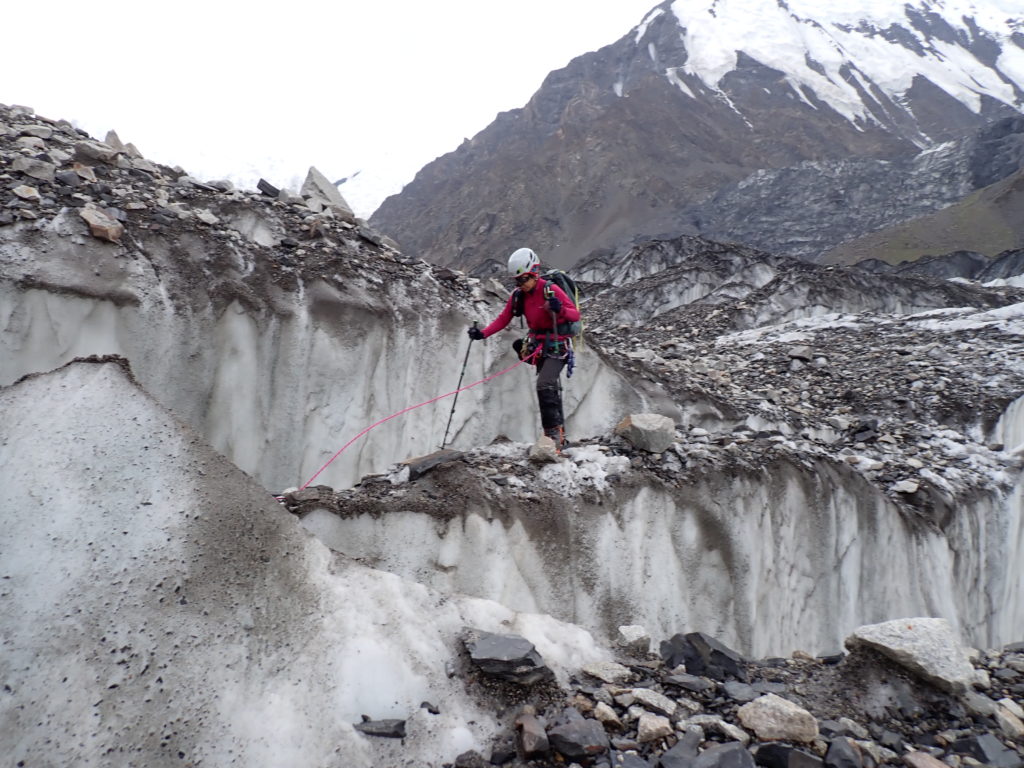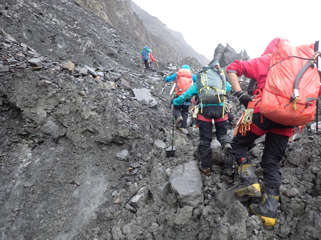 登山活動1日目はBCから本峰取付までの偵察。氷河の右岸に出来たモレーンをひたすら詰めますが、非常に歩きづらく消耗します。