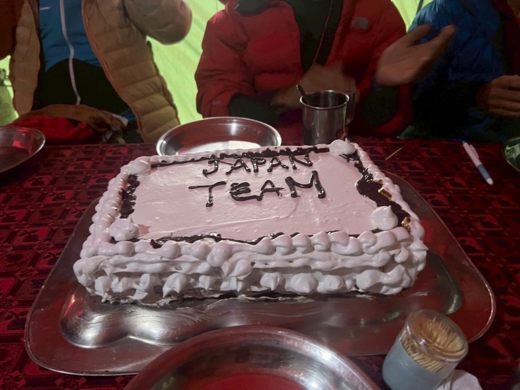 ABC撤収作業を終え全員揃って夕食を頂いた後、何やらスタッフの皆が慌ただしく動いていて訝しんでいると、なんとケーキが!こんな山中で食材を大事に保管し、敗退とはいえ登山活動の終息をこのような形で労ってくれました。
