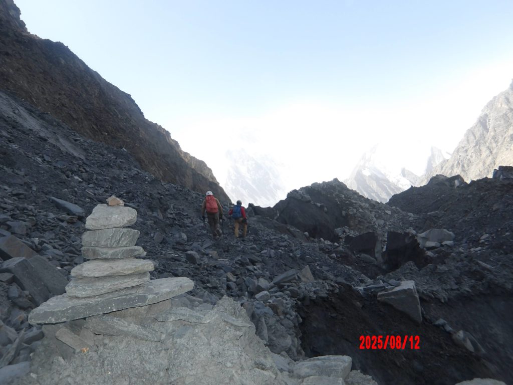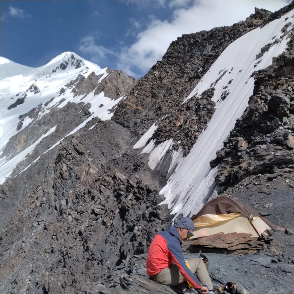 雪を取りに行ったら雪ではなく氷で、急斜面かつ灰色の氷でした。でも貴重な資源なのでアックスで削りながらビニール袋に入れて確保しました。テントに入ると真っ先に水分補給です。まずは行動水をひたすら飲み続け、呼び水分を残して翌日の行動水と夕食用の水を作りました。二人のSPO2を測ると70%台でこのままでは高度障害を発症する懸念があります。隊長は落ち着いていたのですが、私は初めてで、私が行動不能になる事は撤退を意味するので、今日の行動をスマホにメモしつつ飲み続けながら緊張していました。明日は早朝出発と決まり早く寝ようとしましたが、月明かりが眩しく、落石の音が絶える事なく続き、かつ不眠の症状も出て寝れませんでした。