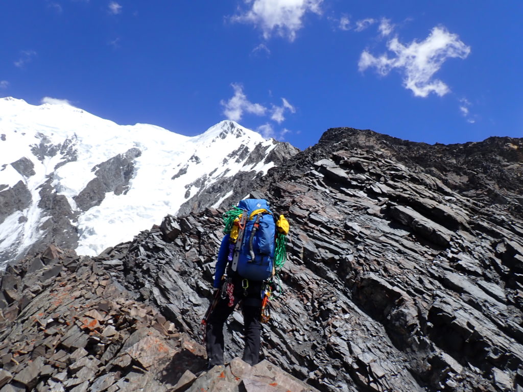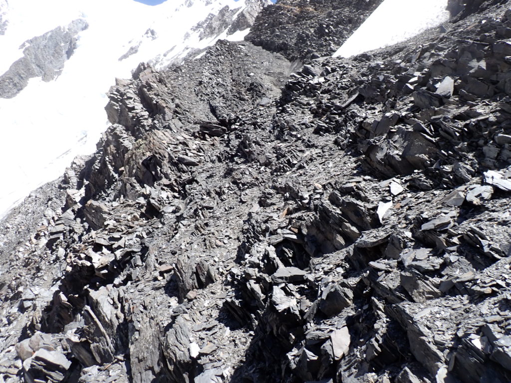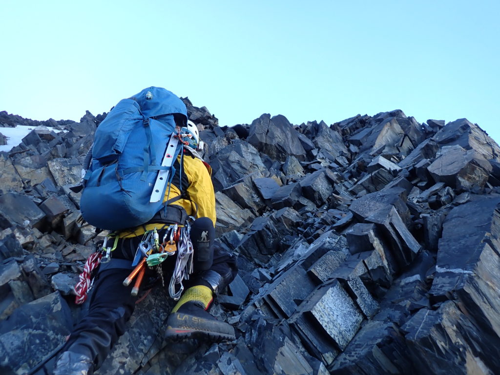 まず目の前のリッジに取り付きましたが、これが積み木リッジで確実なスタンスが皆無でした。岩を落としながら進まざるを得ず、こんな事やってられないと後退を決断。