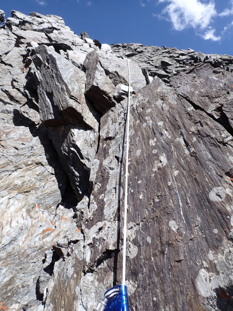 後退の為に懸垂支点に手頃な岩を探しましたがこれも皆無。でも進めない…。仕方無しにクライムダウンを敢行。