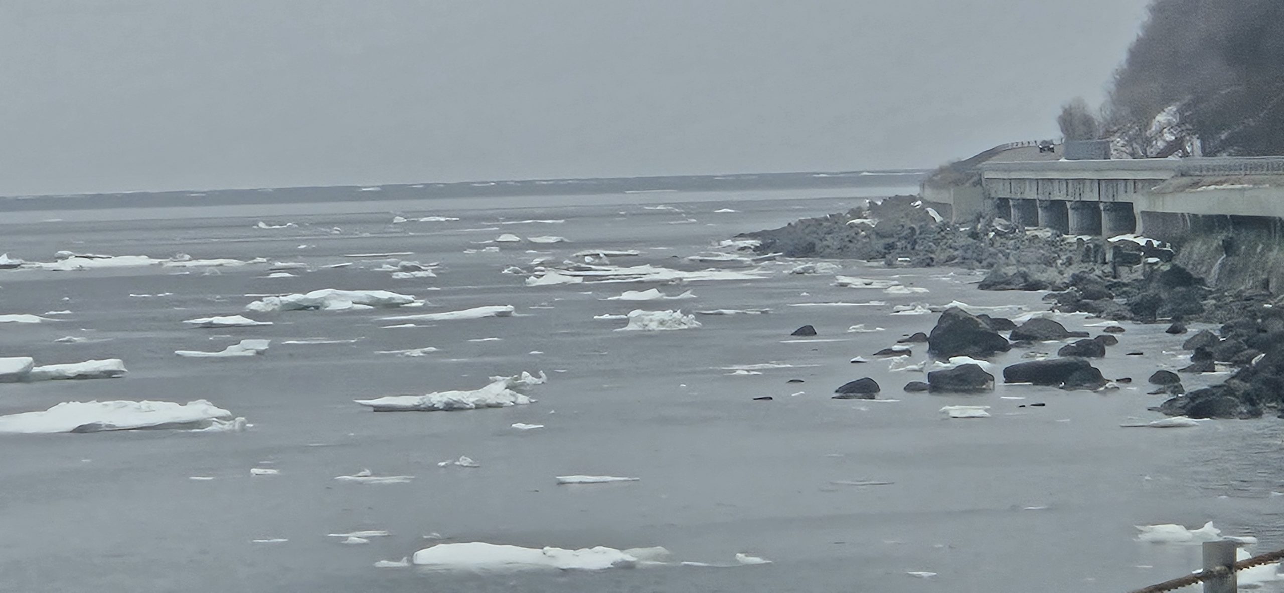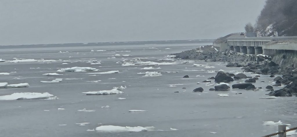 4/2(木) 5:00札幌発。ウトロは灰色の空。灰色の海に流氷が浮かんでいた。